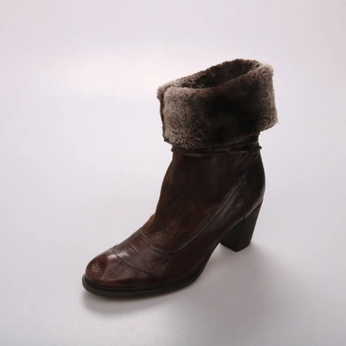 Женские зимние ботильоны из натуральной кожи с меховым отворотом и устойчивым каблуком. Подойдут для повседневной носки в холодную погоду и хорошо смотрятся с джинсами или платьями. Удобная молния сбоку помогает быстро обуваться.