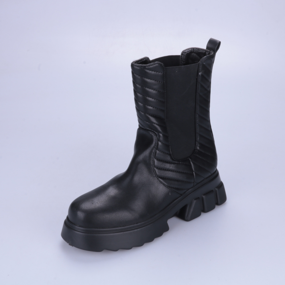 Женские чёрные ботинки без указанного бренда, укороченная модель на массивной рельефной подошве. Эластичные боковые вставки и петля сзади помогают быстро надевать, подойдут на каждый день в прохладную погоду. Плотная подошва хорошо амортизирует и устой...