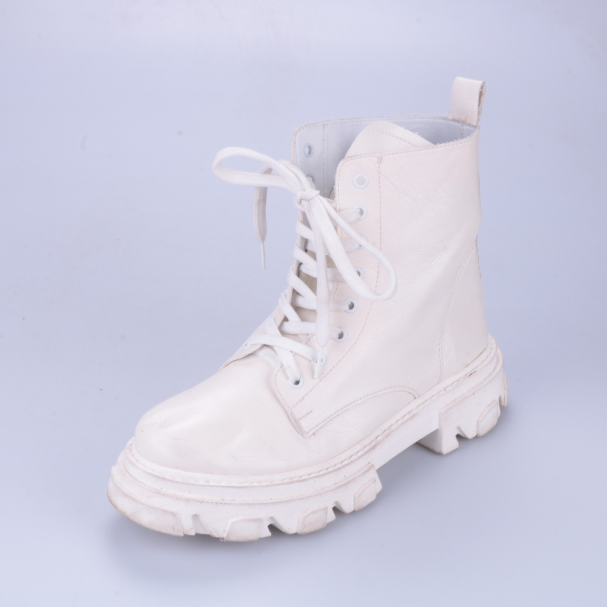 Женские белые ботинки на шнуровке с высокой посадкой и массивной тракторной подошвой. Подойдут для повседневных городских образов в межсезонье и прохладную погоду. Рельефная подошва даёт хорошее сцепление и делает обувь устойчивее.