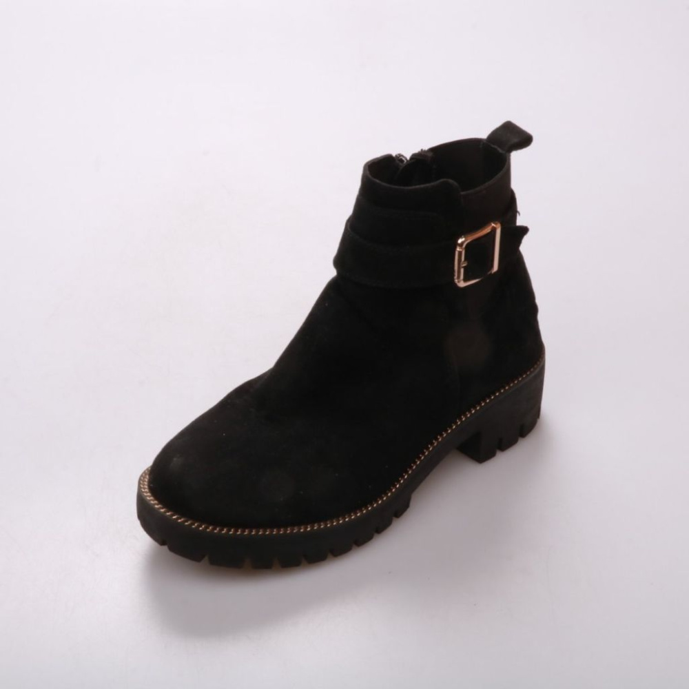 Женские ботинки из чёрного материала под замшу, с боковой молнией и декоративной пряжкой у щиколотки. Подойдут на каждый день в межсезонье под джинсы и брюки благодаря лаконичному силуэту. Рифлёная подошва даёт более уверенное сцепление на мокром асфал...