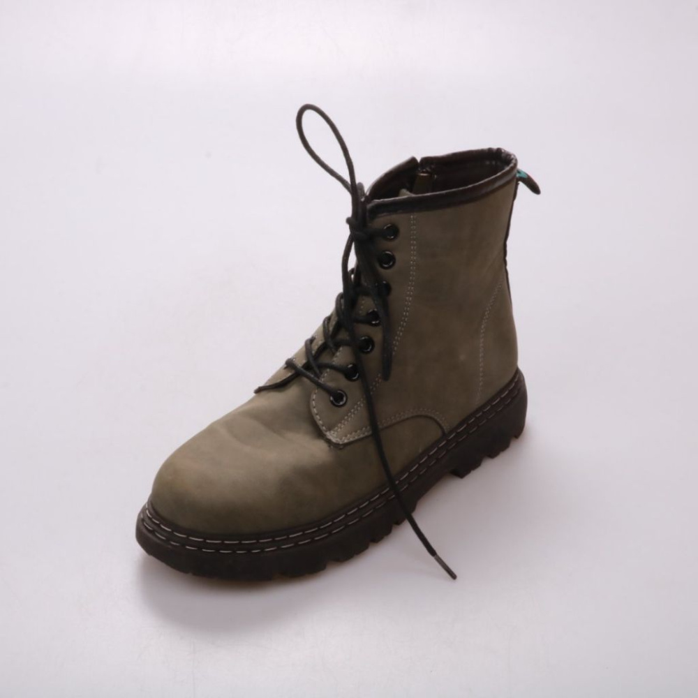 Высокие ботинки на шнуровке с боковой молнией, удобные для повседневной носки в городе. Матовый верх в хаки/оливковом оттенке и толстая подошва с протектором хорошо подходят для прохладной погоды. Практичное преимущество — молния сбоку, можно быстро об...