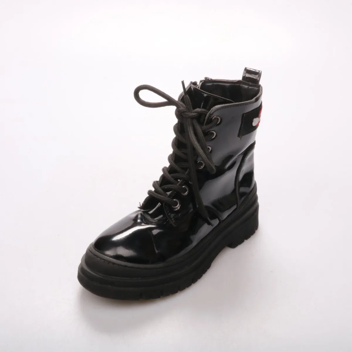 Женские ботинки в черном цвете из лакированной экокожи на массивной тракторной подошве. Подойдут для повседневных образов в межсезонье и прохладную погоду, удобно фиксируются шнуровкой и имеют боковую молнию. Практичное преимущество — плотная подошва с рельефным протектором дает хорошее сцепление и меньше скользит.