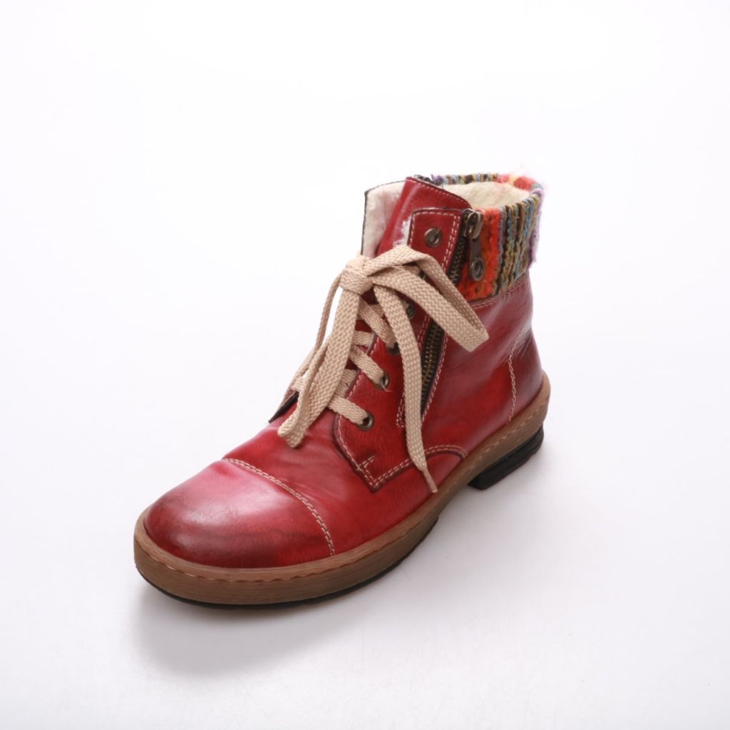 Женские ботинки Rieker из красной кожи с боковой молнией и шнуровкой, с вязаным воротником. Подойдут на каждый день в межсезонье и прохладную погоду. Практичная подошва с протектором даёт устойчивость на мокрых дорожках.