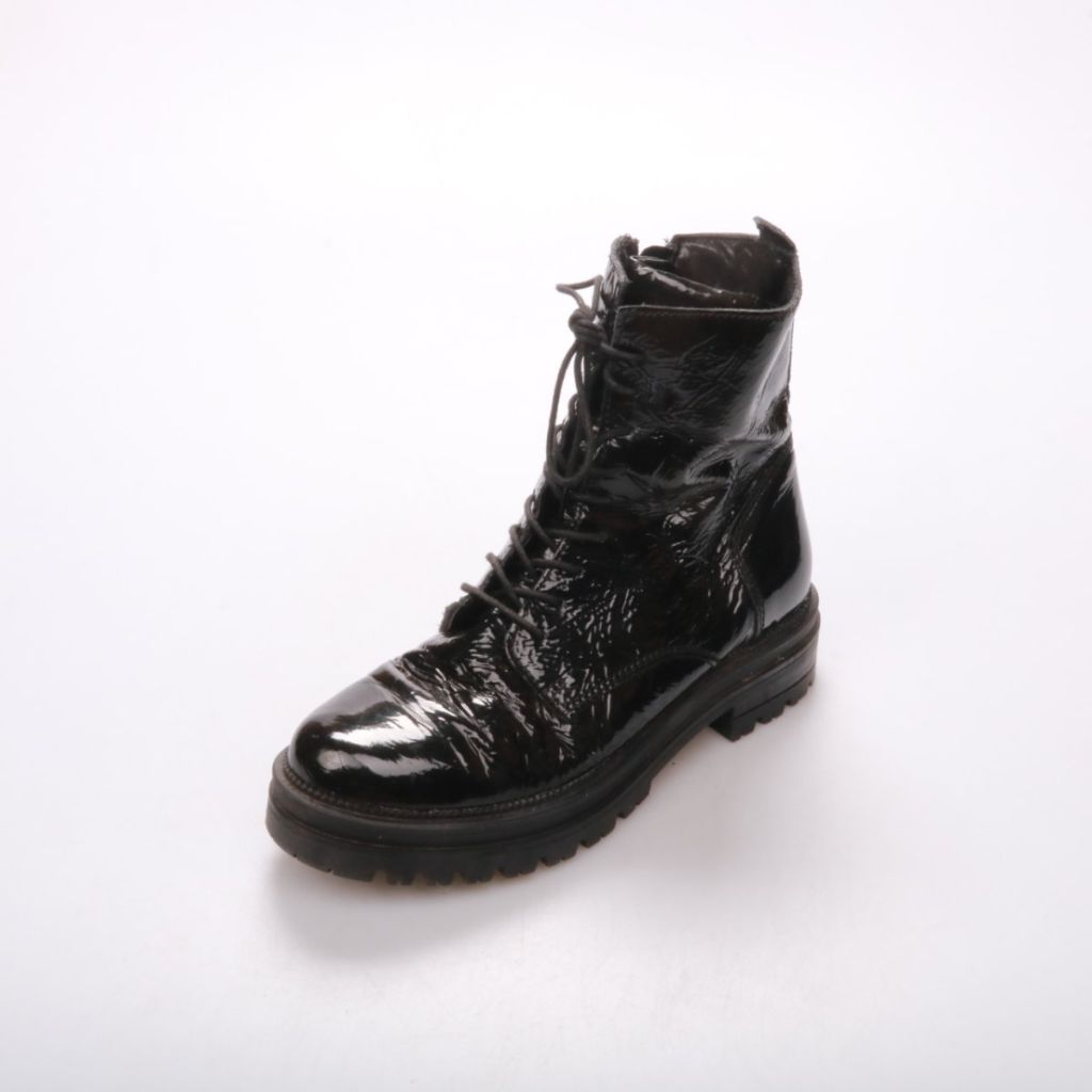 Женские лаковые ботинки на шнуровке с боковой молнией и тракторной подошвой. Подойдут для повседневной носки в прохладную погоду и на межсезонье. Практичное преимущество — плотная подошва с выраженным протектором меньше скользит на мокрой поверхности.