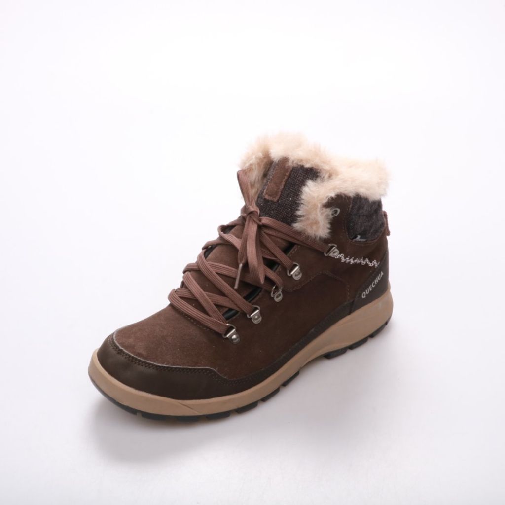 Зимние ботинки QUECHUA (Decathlon) в коричневом цвете, с утеплённым мягким меховым кантом и шнуровкой. Подойдут для прогулок и повседневной носки в холодную погоду. Рельефная резиновая подошва даёт хорошее сцепление на скользких поверхностях.