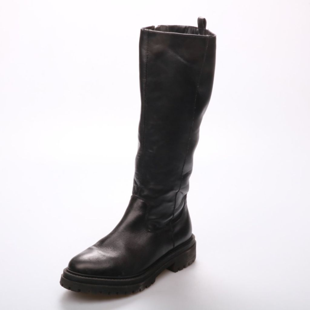 Женские высокие сапоги Geox из гладкой чёрной кожи на массивной тракторной подошве. Сбоку застёжка-молния, удобно надевать и снимать, подойдут для городских прогулок в прохладную погоду. Рельефная подошва даёт более уверенное сцепление на мокром асфальте.