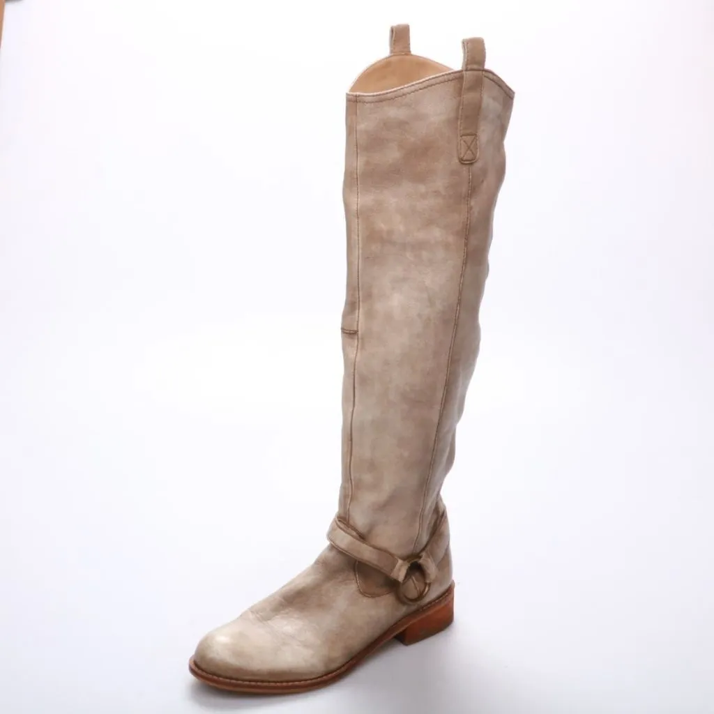 Кожаные сапоги без указания бренда, высокая голенище и ремешок с пряжкой у щиколотки. Подойдут для повседневной носки в межсезонье с джинсами, платьями и юбками. Практичное преимущество — устойчивый низкий каблук и удобные петли для надевания.
