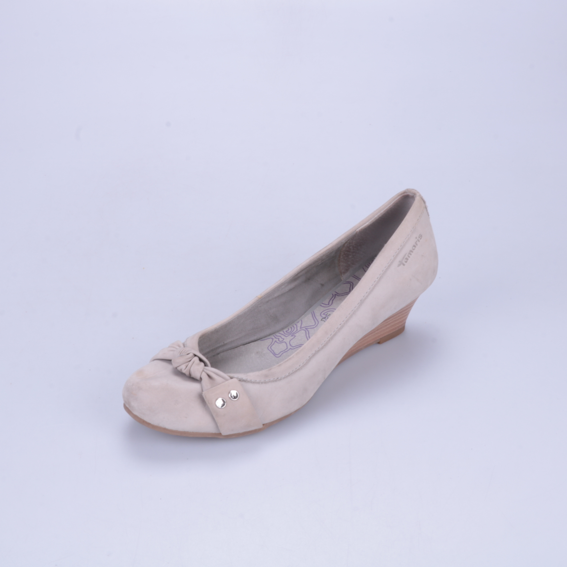 Туфли Tamaris в бежевом цвете на невысокой танкетке, с аккуратным узлом на носке и декоративными заклёпками. Подойдут для повседневных образов и офиса в тёплый сезон. За счёт устойчивой подошвы комфортны для длительной ходьбы.