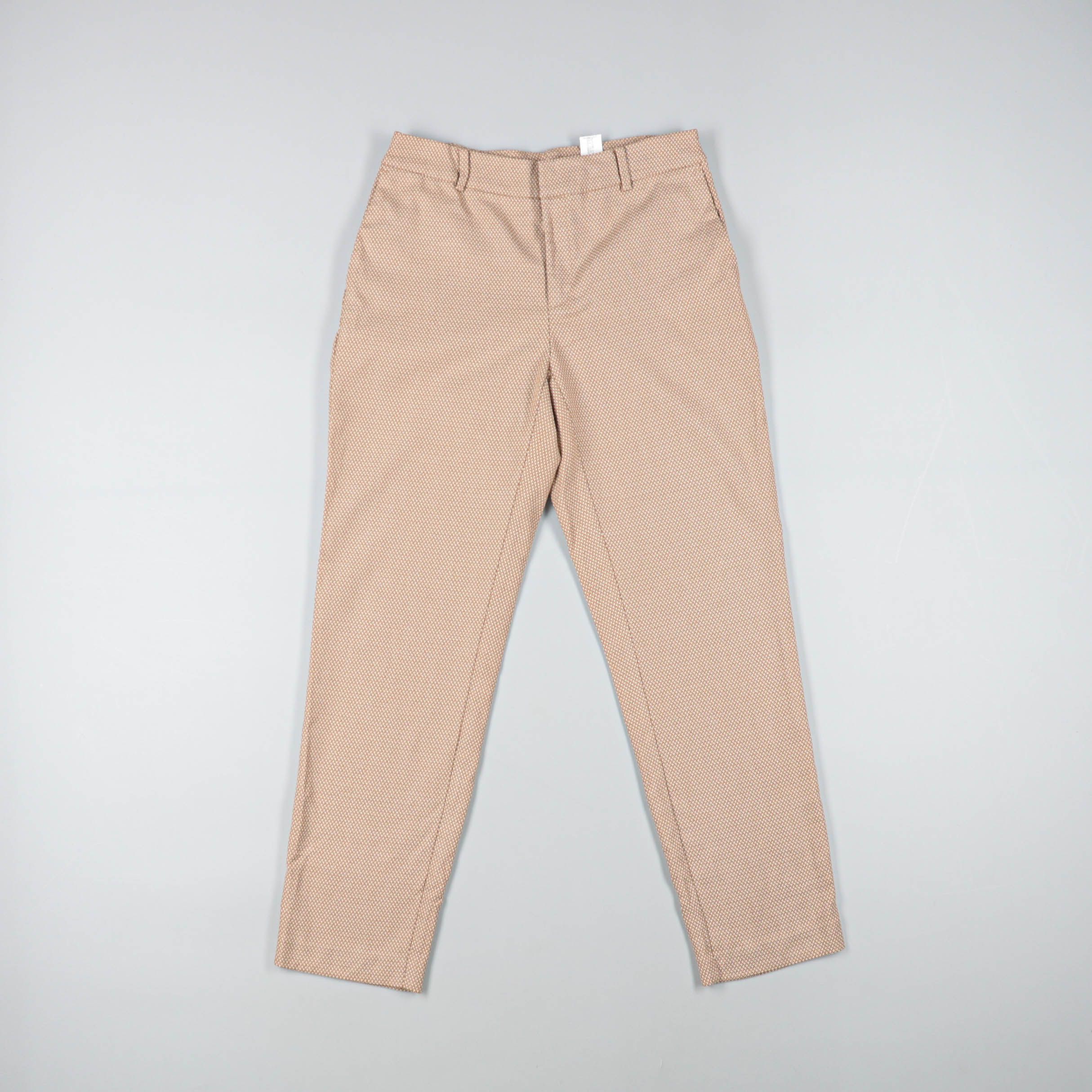 Женские брюки прямого кроя в светло-бежевом оттенке с мелким фактурным узором. Подойдут для офиса и повседневных образов с рубашкой или трикотажем. Практичный плюс — нейтральный цвет легко сочетается с базовой обувью и верхом.