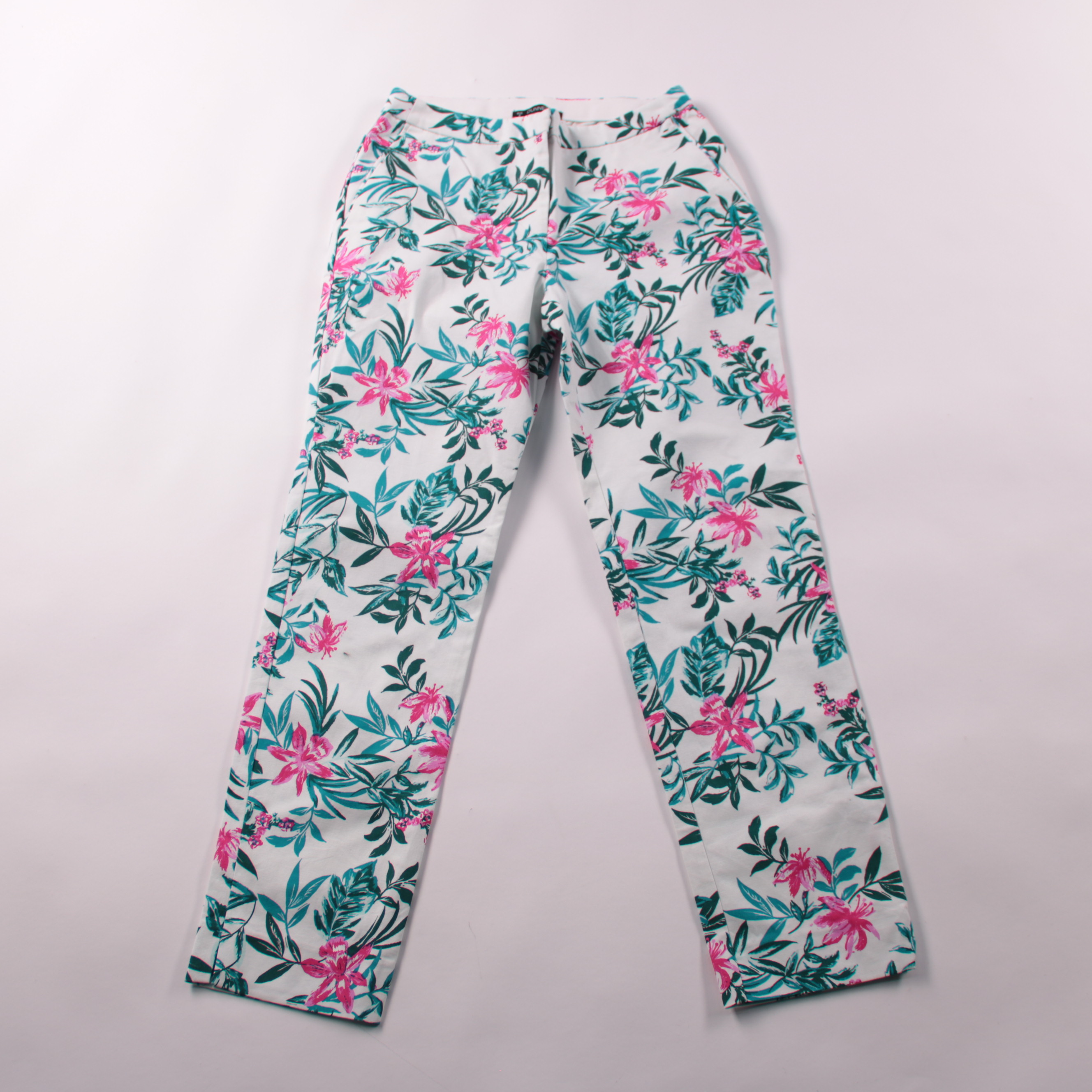 Женские брюки Dunnes с ярким цветочным принтом на светлой основе. Подойдут для лета и отпуска, хорошо смотрятся с однотонными топами и кедами или сандалиями. Хлопковая ткань с добавлением эластана приятна к телу и немного тянется, поэтому в них комфорт...