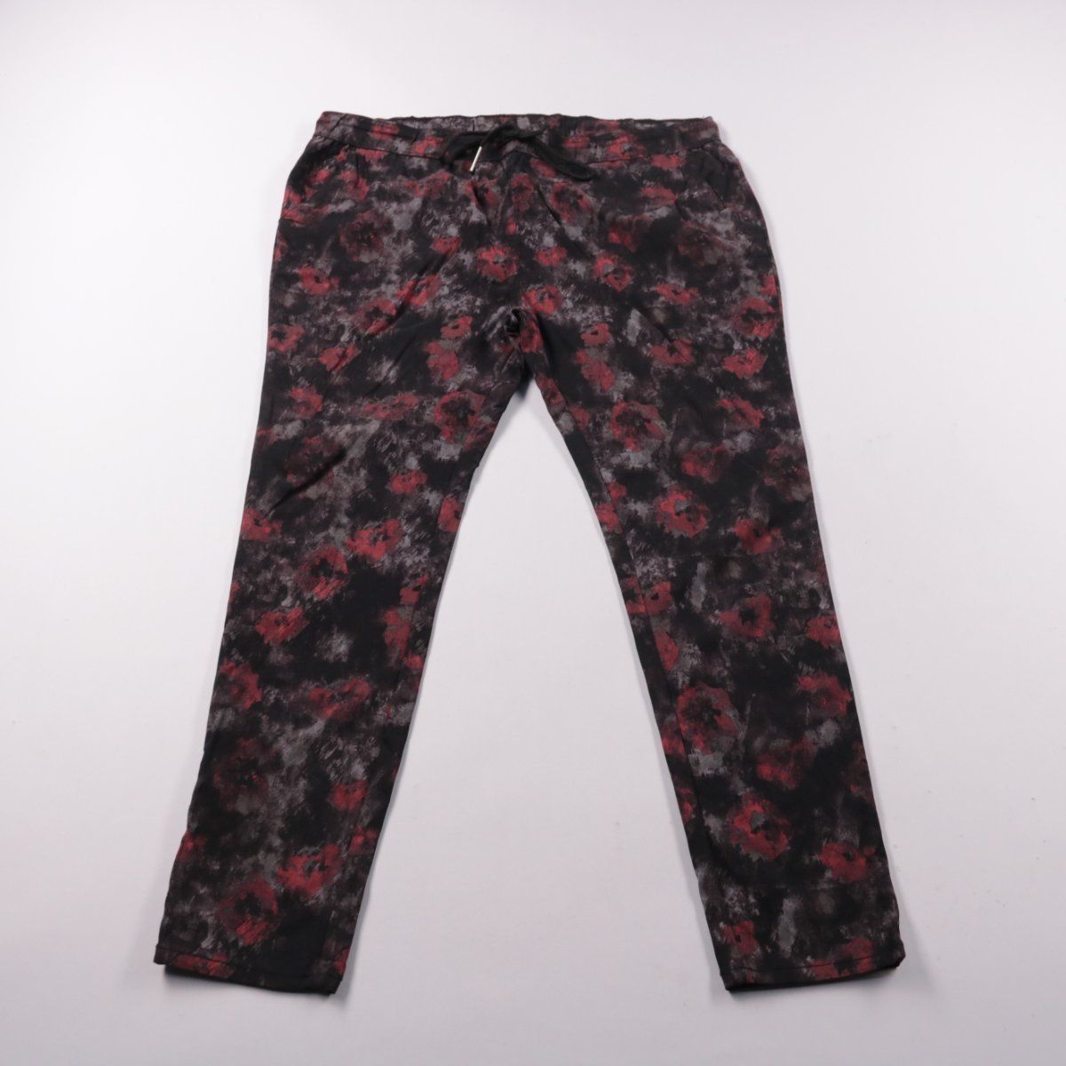 Женские брюки Janina с абстрактным принтом в чёрно‑серо‑бордовой гамме и эластичным поясом на шнурке. Подойдут для повседневных образов и поездок, когда хочется яркого акцента без лишней строгости. Материал тянется и комфортно сидит, не сковывая движения.