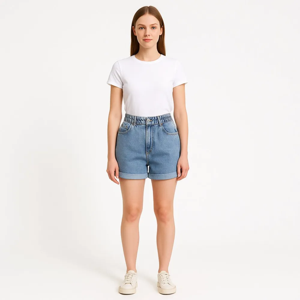 Джинсовые шорты FB Sister голубого цвета с высокой посадкой и эластичной сборкой на талии. Подойдут для летних прогулок и повседневных образов с футболками и кедами. Плотный деним хорошо держит форму и удобен в носке.