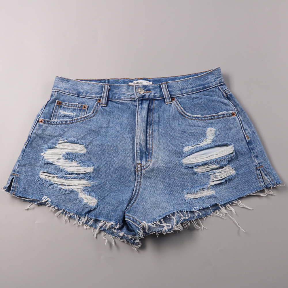Джинсовые шорты Pull&Bear из 100% хлопка, голубые, с высокой посадкой и рваными элементами/необработанным краем. Подойдут для летних прогулок и отдыха, легко сочетаются с футболками и топами. Плотный деним хорошо держит форму и рассчитан на частую носку.