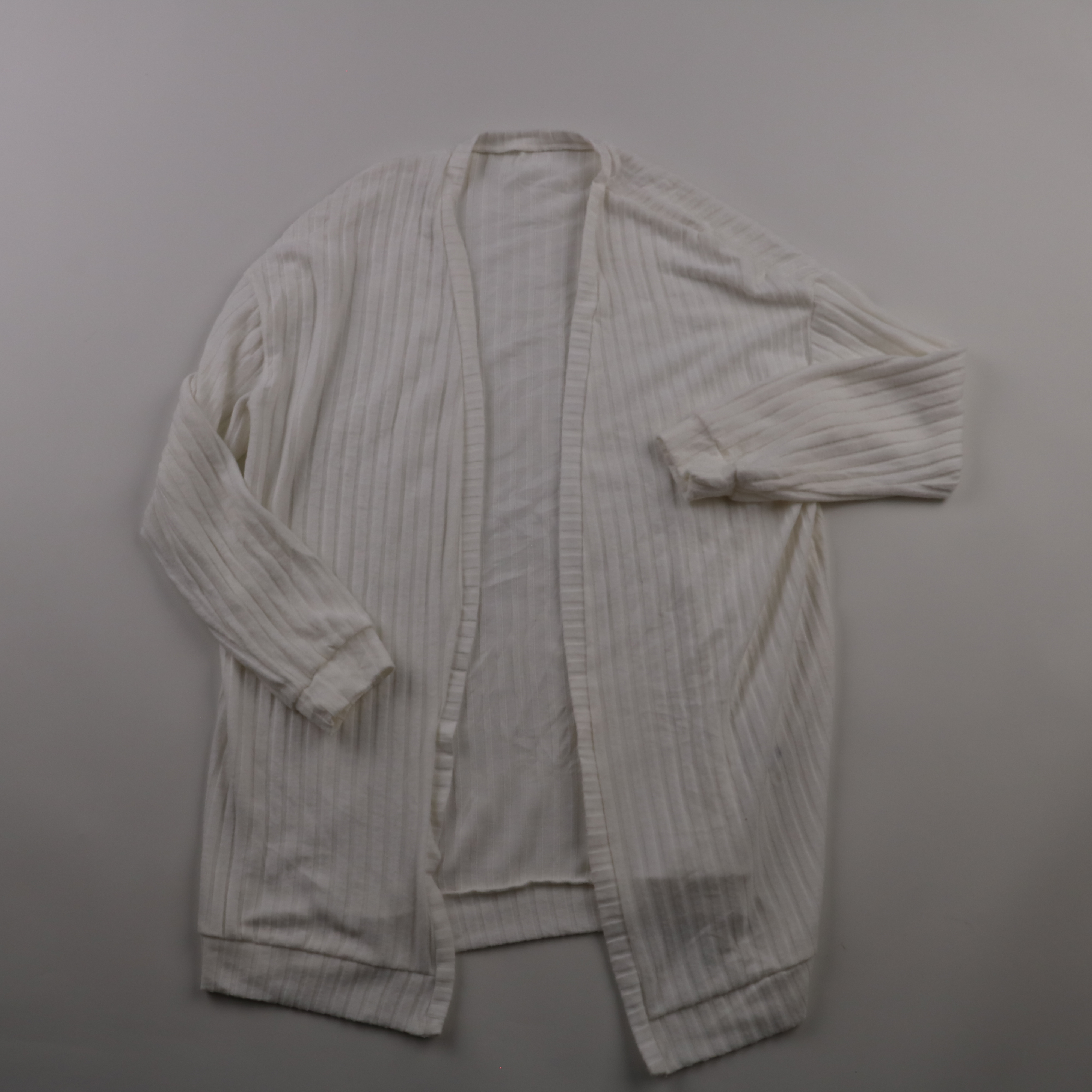 Белый кардиган в рубчик без застёжки, прямого свободного кроя. Подойдёт для офиса и прогулок: легко накинуть поверх топа или платья в прохладную погоду. Практичное преимущество — хорошо сочетается с базовыми вещами и почти не мнётся.