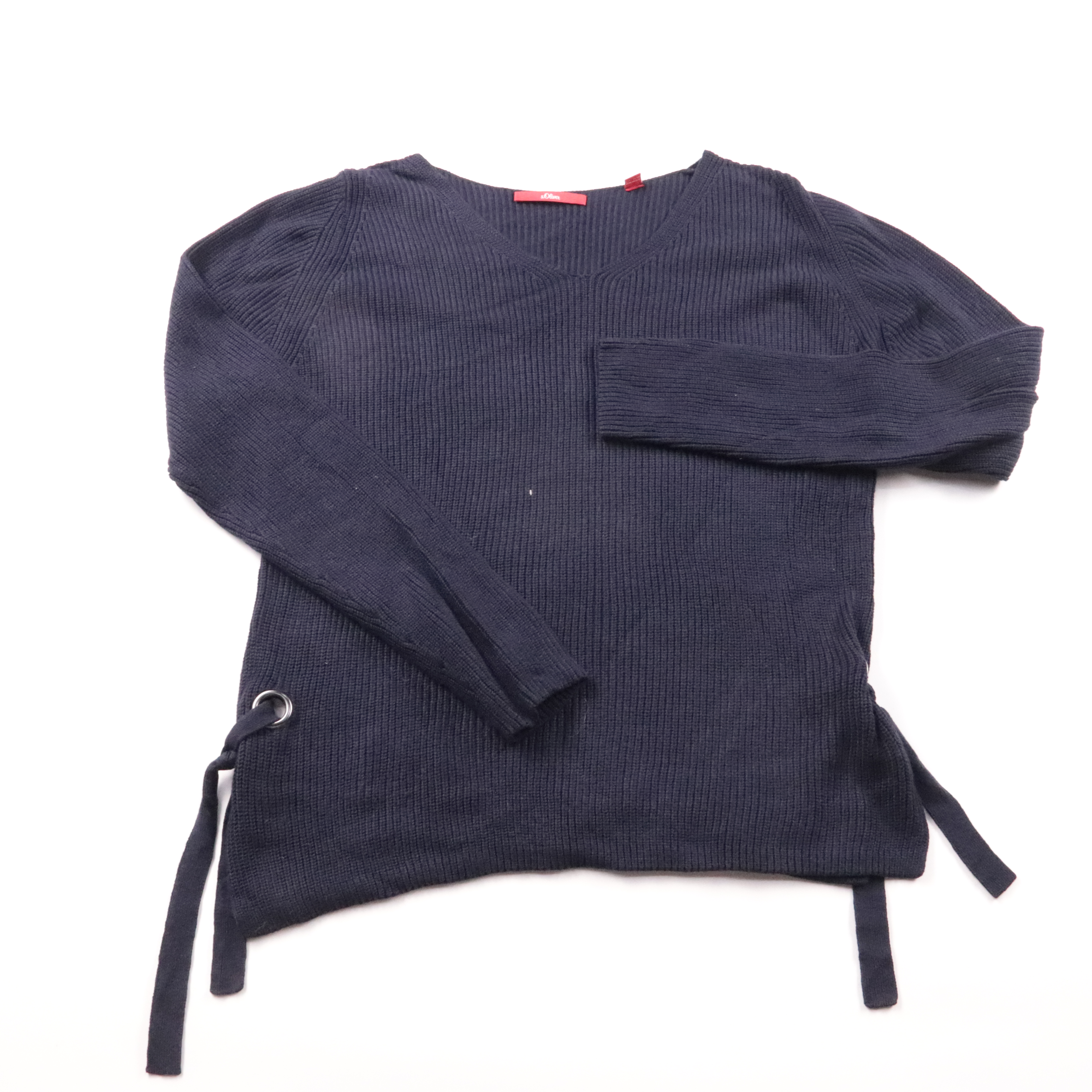 Трикотажный джемпер S.Oliver в тёмно-синем цвете с V-образным вырезом и фактурной вязкой в рубчик. Подойдёт для повседневных образов в офис или на каждый день, хорошо смотрится с джинсами и юбками. За счёт смесового состава с вискозой мягкий и комфортн...