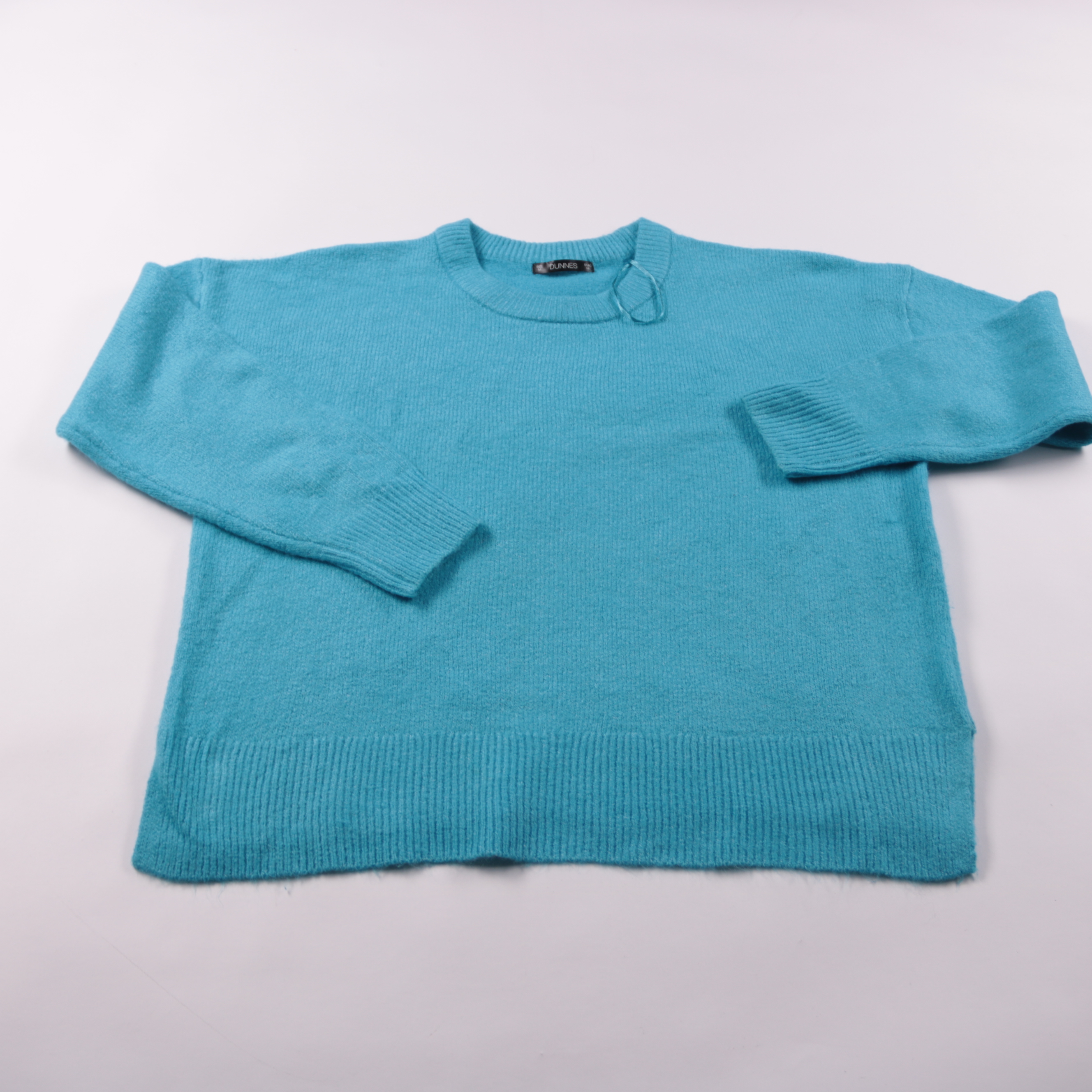 Вязаный свитер Dunnes Stores ярко-голубого цвета с круглым вырезом и широкими манжетами. Подойдёт для повседневных образов в прохладную погоду — с джинсами или юбкой. Практичный плюс: мягкий трикотаж с добавлением эластана лучше держит форму.