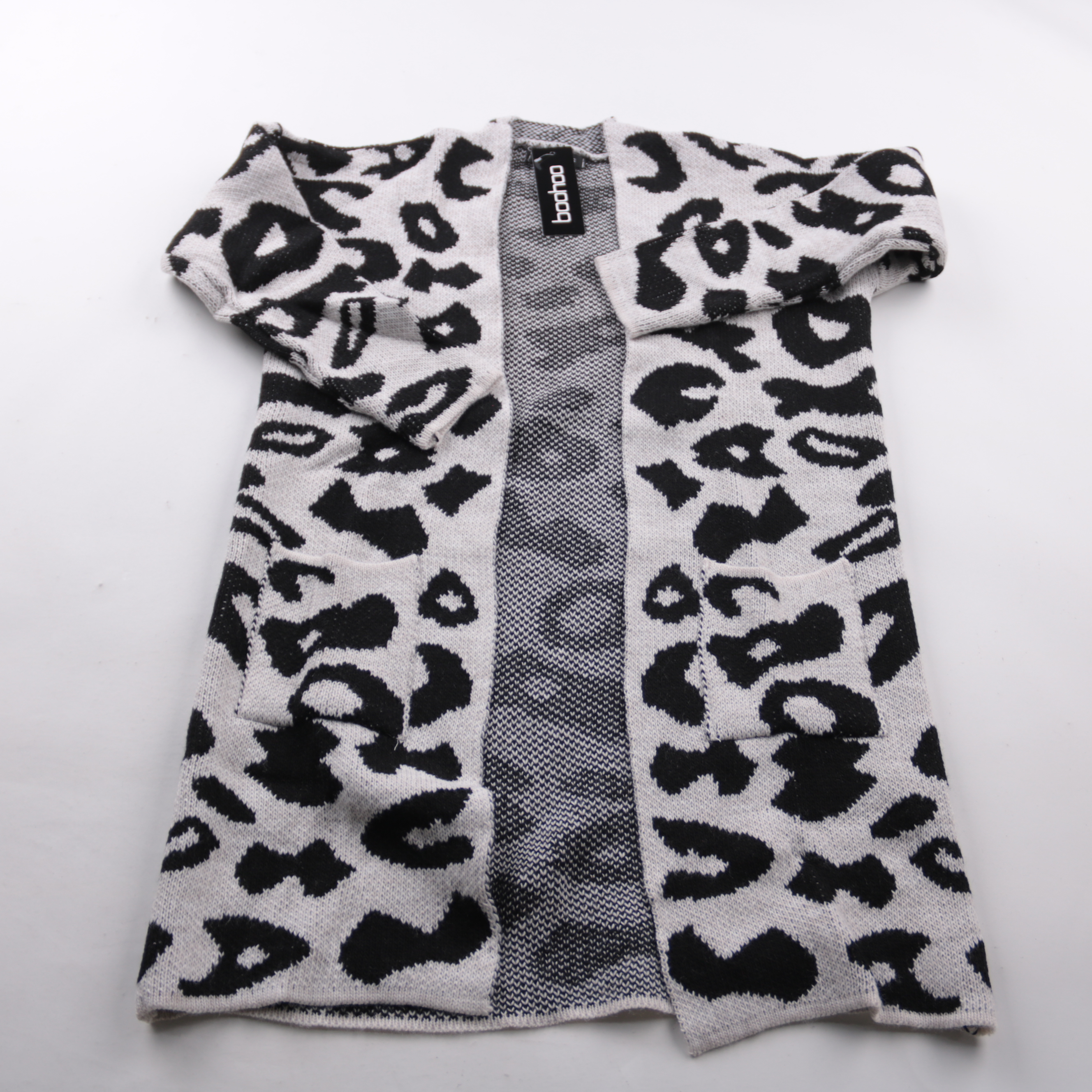 Вязаный кардиган Boohoo с контрастным леопардовым принтом и открытым передом. Подойдёт для прохладных дней — удобно накинуть на топ или платье в повседневных образах. Практичные карманы и мягкая вязка делают его комфортным для носки.