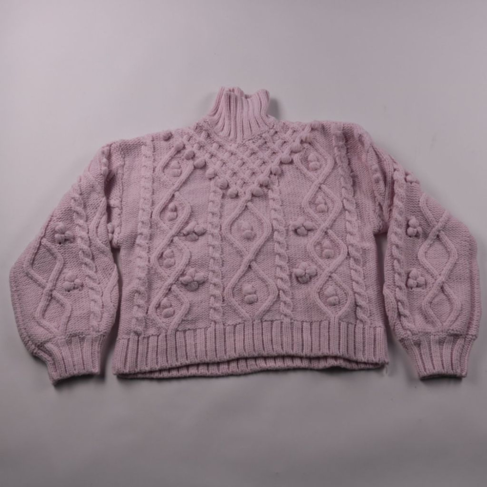 Вязаный свитер Zara нежно-розового цвета с высоким воротником и рельефным узором «косы» и шишечки. Подойдёт для холодной погоды и уютных повседневных образов с джинсами или юбкой. Плотная вязка хорошо держит тепло и выглядит фактурно.