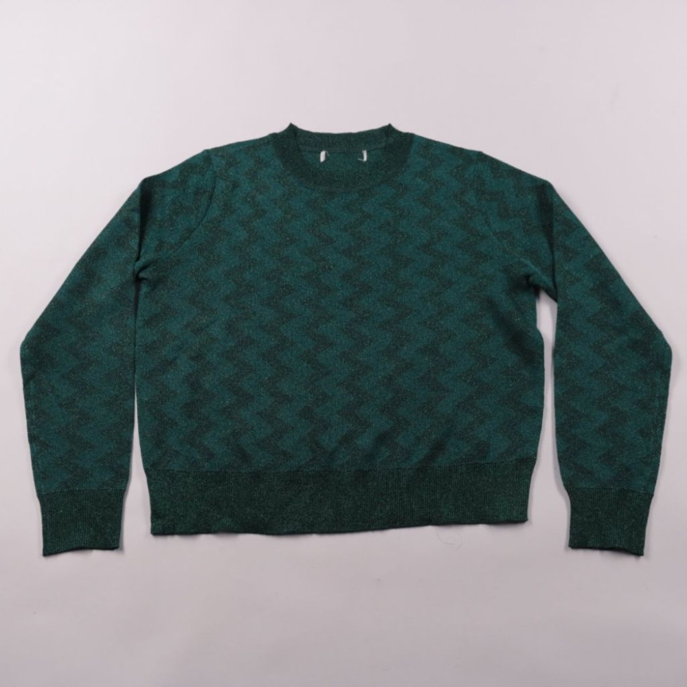 Вязаный джемпер без указания бренда, глубокого зелёного (изумрудного) цвета с фактурным узором. Подойдёт для повседневных образов на работу или учёбу, хорошо смотрится с джинсами и брюками. Трикотаж мягкий и тёплый, удобно носить как самостоятельный сл...