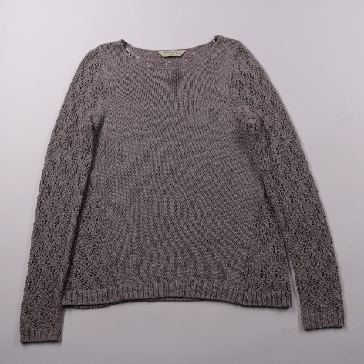 Вязаный джемпер Gallery серого цвета с ажурными рукавами и круглым вырезом. Подойдёт для повседневных образов в прохладную погоду и для офиса с рубашкой или топом. Лёгкий трикотаж не мнётся и прост в уходе.