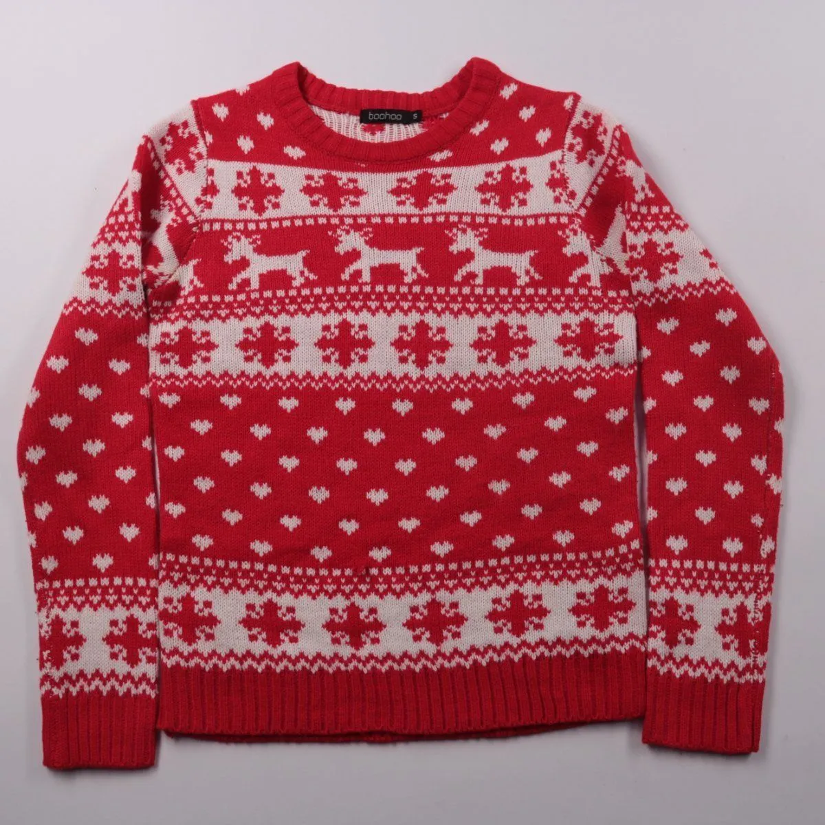 Свитер Boohoo красного цвета с новогодним жаккардовым узором (олени и снежинки). Подойдёт для зимних прогулок, праздников и уютных образов дома. Мягкий акрил хорошо держит форму и прост в уходе.