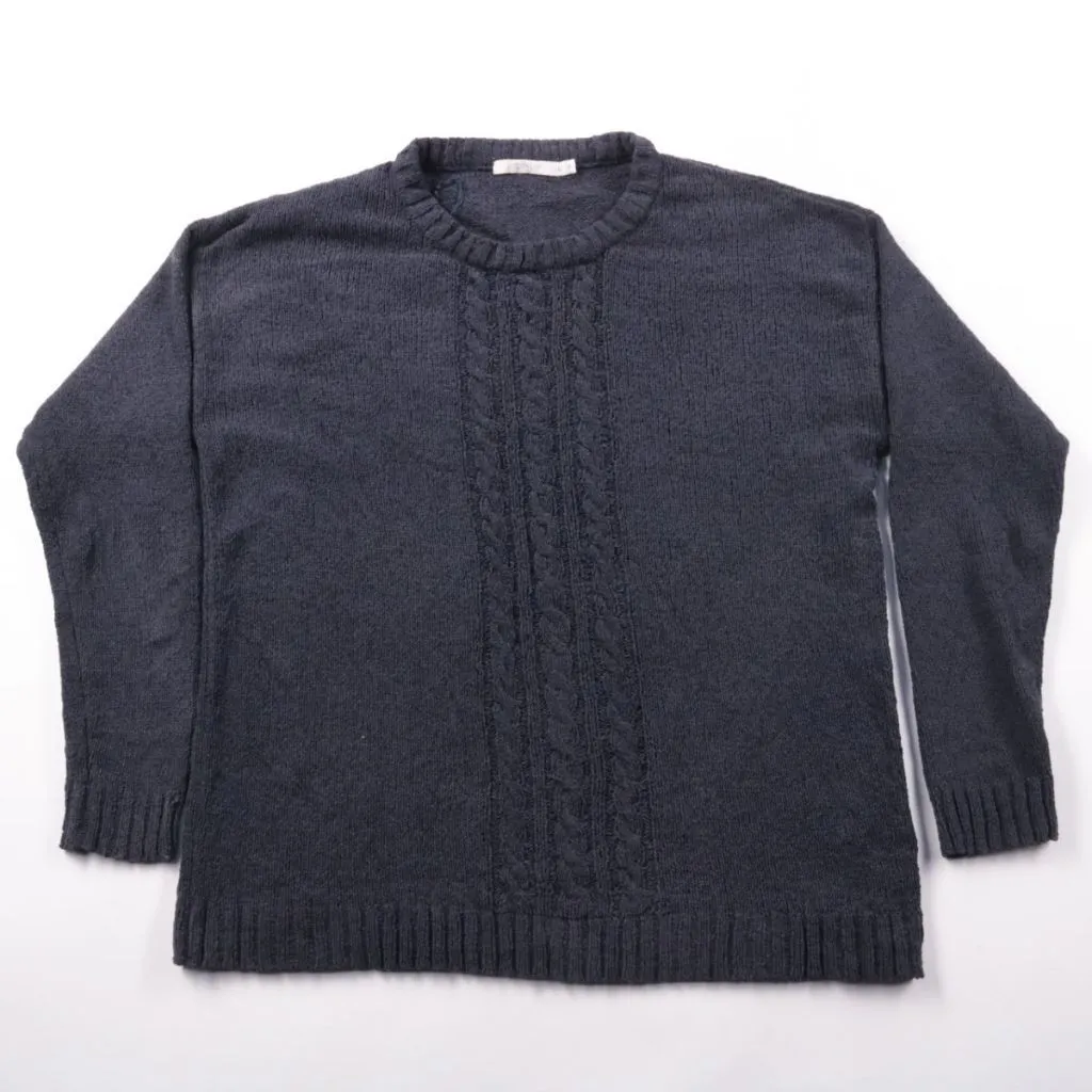 Свитер Sirup тёмно-синего цвета с круглым вырезом и фактурной косой по центру. Подойдёт для повседневной носки и офисных образов в прохладную погоду, хорошо сочетается с джинсами и брюками. Натуральный хлопок делает модель дышащей и комфортной в носке.