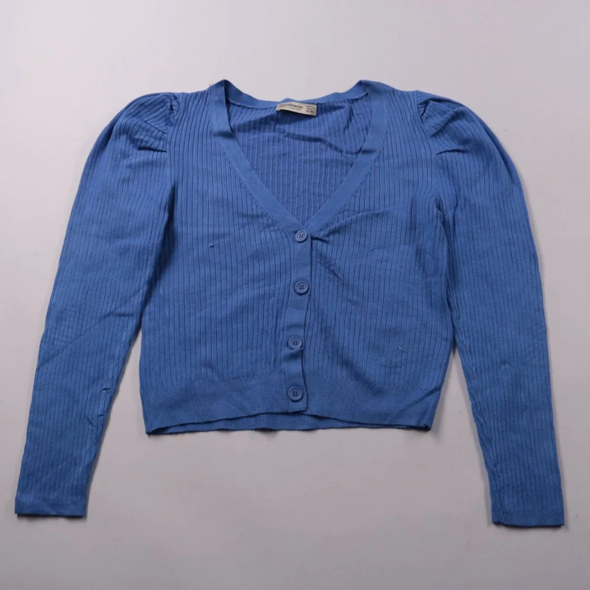 Укороченный кардиган Stradivarius синего цвета в рубчик, с V-образным вырезом и застёжкой на пуговицы. Подойдёт для повседневных образов и как второй слой в прохладную погоду. Трикотаж тянется и удобно садится по фигуре.