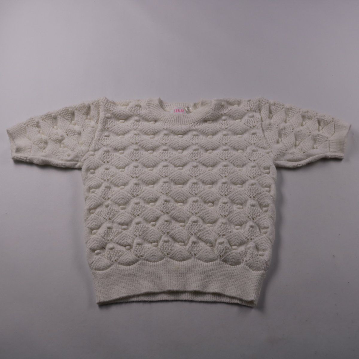 Вязаный джемпер Savida молочного оттенка off white с фактурным узором и коротким рукавом. Подойдёт для повседневных образов и многослойных комплектов в прохладную погоду. Смесовая пряжа с полиэстером и акрилом практична в уходе и быстро сохнет.