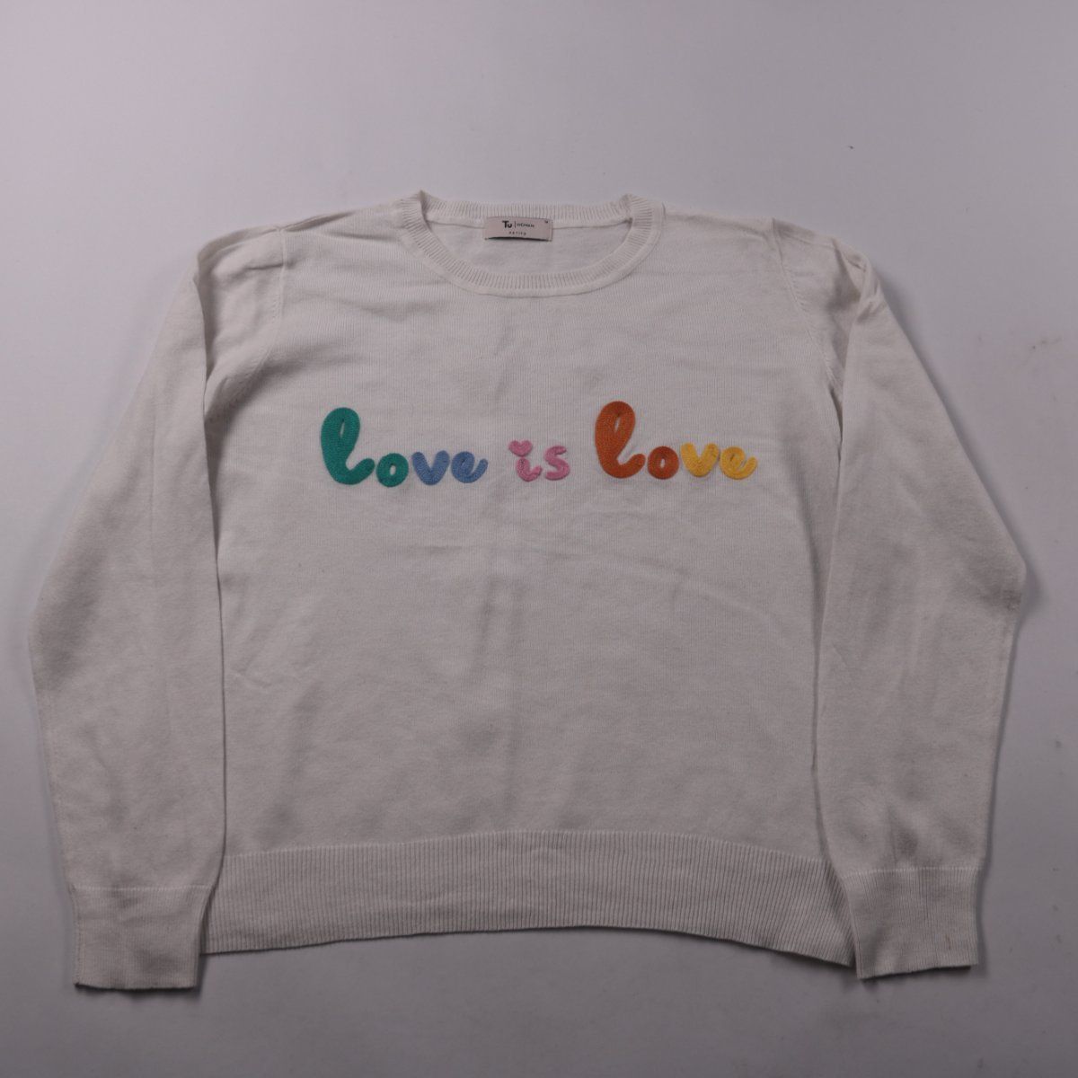Женский джемпер Tu Woman Petite молочного цвета с надписью «love is love» на груди. Подойдёт для повседневных образов и как слой под куртку в прохладную погоду. Мягкий трикотаж и базовый цвет легко сочетать с джинсами и юбками.