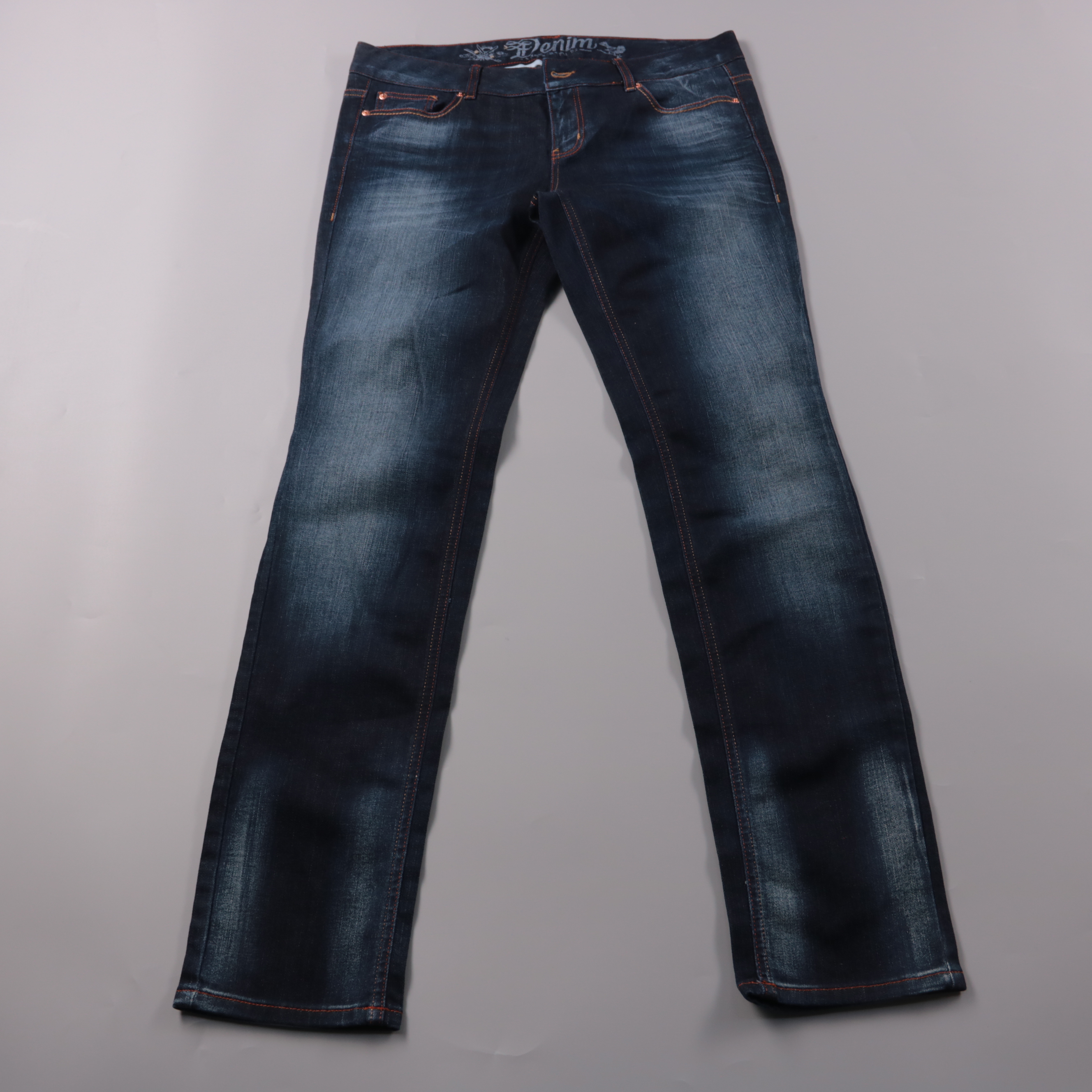 Женские джинсы Denim тёмно-синего цвета с лёгким эффектом высветления и контрастной строчкой. Подойдут для повседневных образов и на выход в сочетании с кедами или ботинками. Плотный деним с добавлением эластана комфортно садится по фигуре и не сковыва...