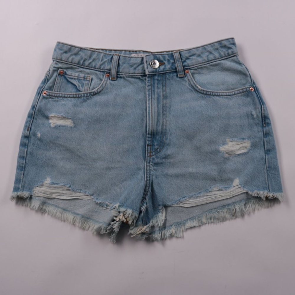 Джинсовые шорты Primark из плотного хлопка, светло-голубой расцветки с эффектом потертостей и рваным краем. Подойдут для летних прогулок и отдыха, легко сочетаются с футболками и топами. Практичны за счёт прочного денима и удобных карманов.