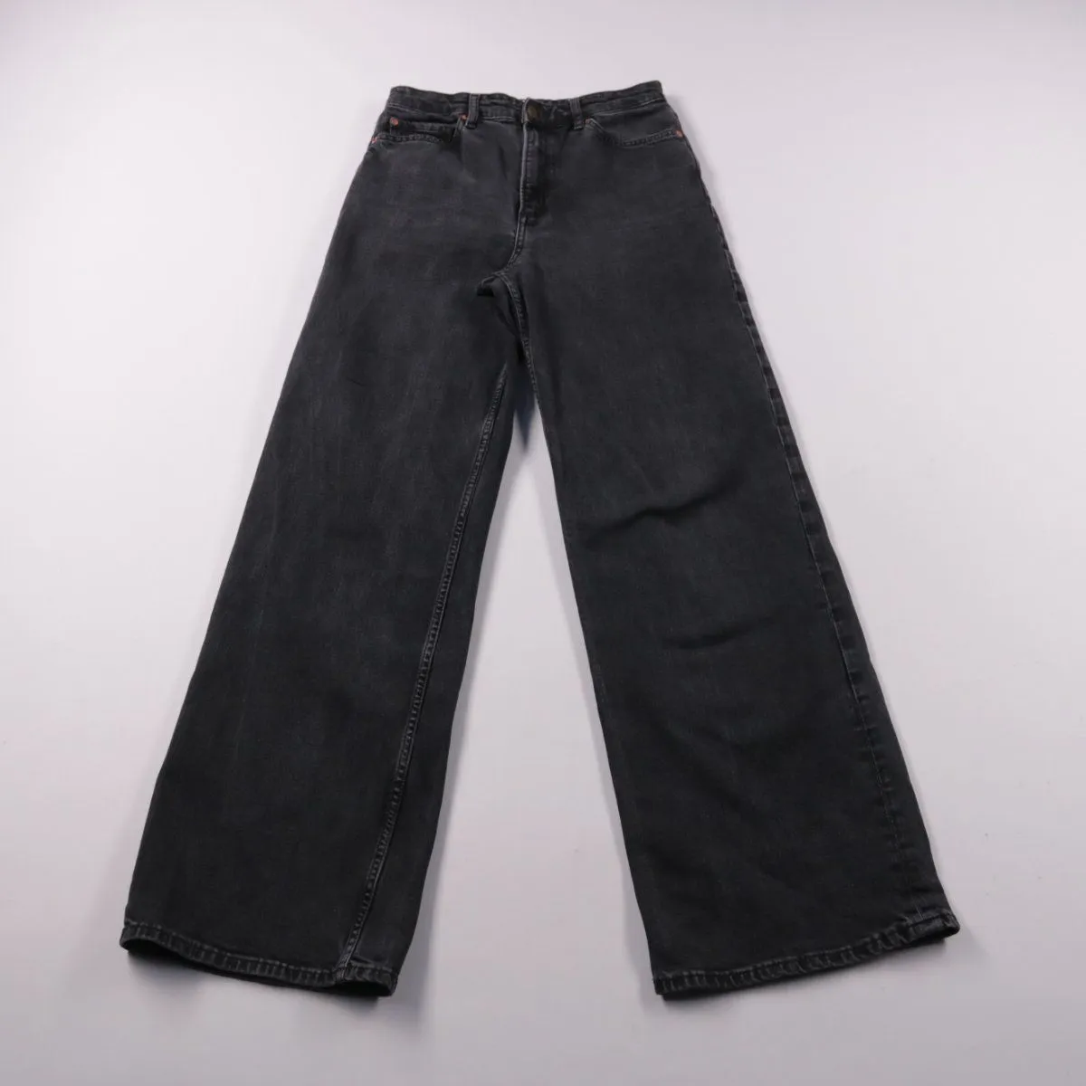 Женские джинсы из чёрного денима с высокой посадкой и широкими штанинами. Подойдут для повседневных образов и на выход — легко сочетаются с футболками, рубашками и жакетами. Плотная ткань хорошо держит форму и комфортна в носке.
