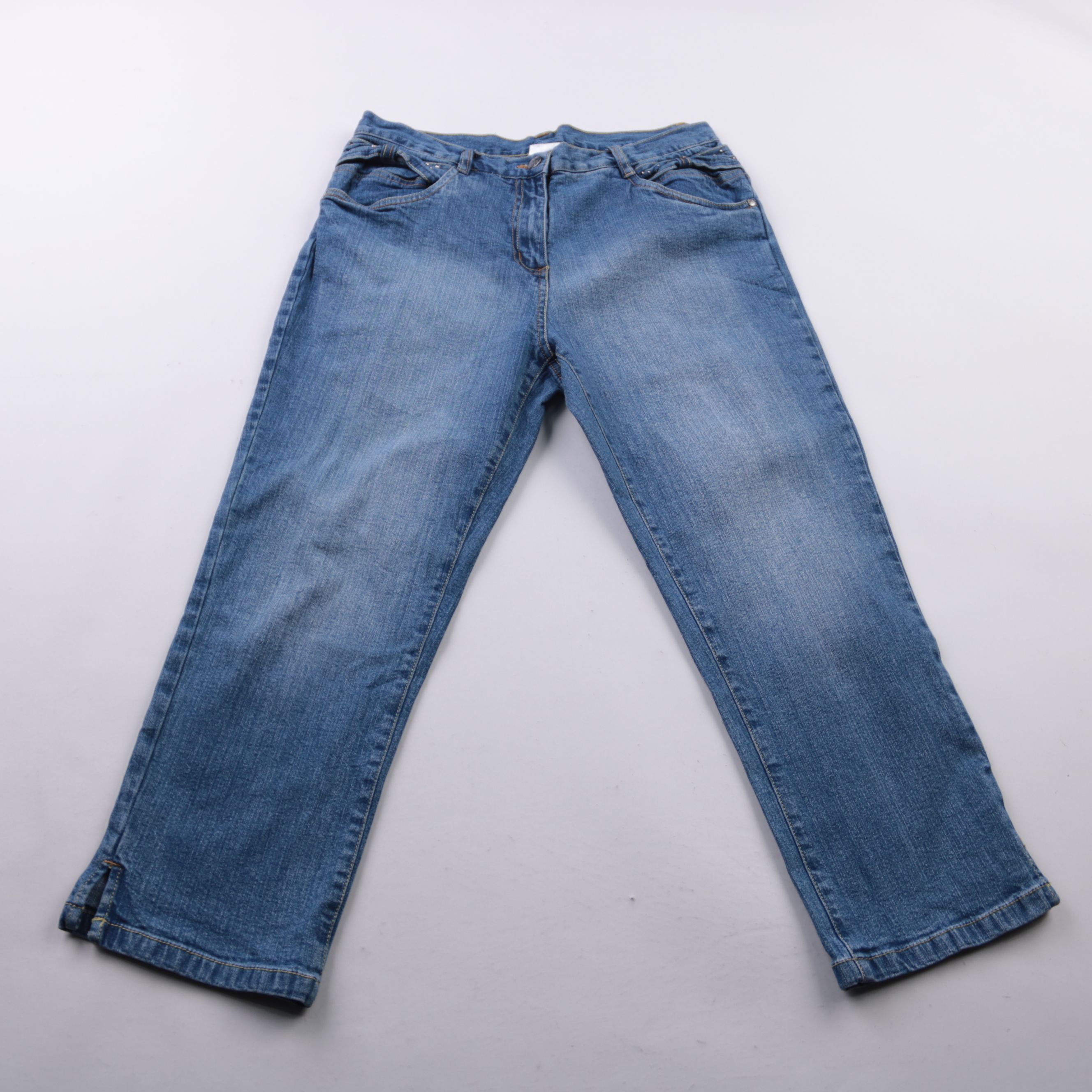 Женские джинсы из синего денима, бренд не указан. Прямой крой с лёгкими потёртостями подойдёт для повседневных образов и прогулок. Ткань с добавлением эластана чуть тянется и комфортнее садится по фигуре.