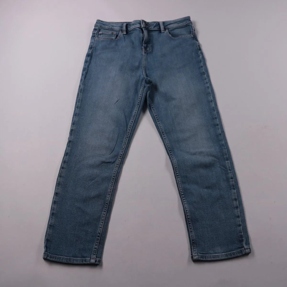 Женские джинсы F&F из синего денима, классическая посадка с застёжкой на молнию и пуговицу. Подойдут для повседневных образов на работу, учёбу и прогулки. Плотная ткань хорошо держит форму и легко сочетается с базовым верхом.