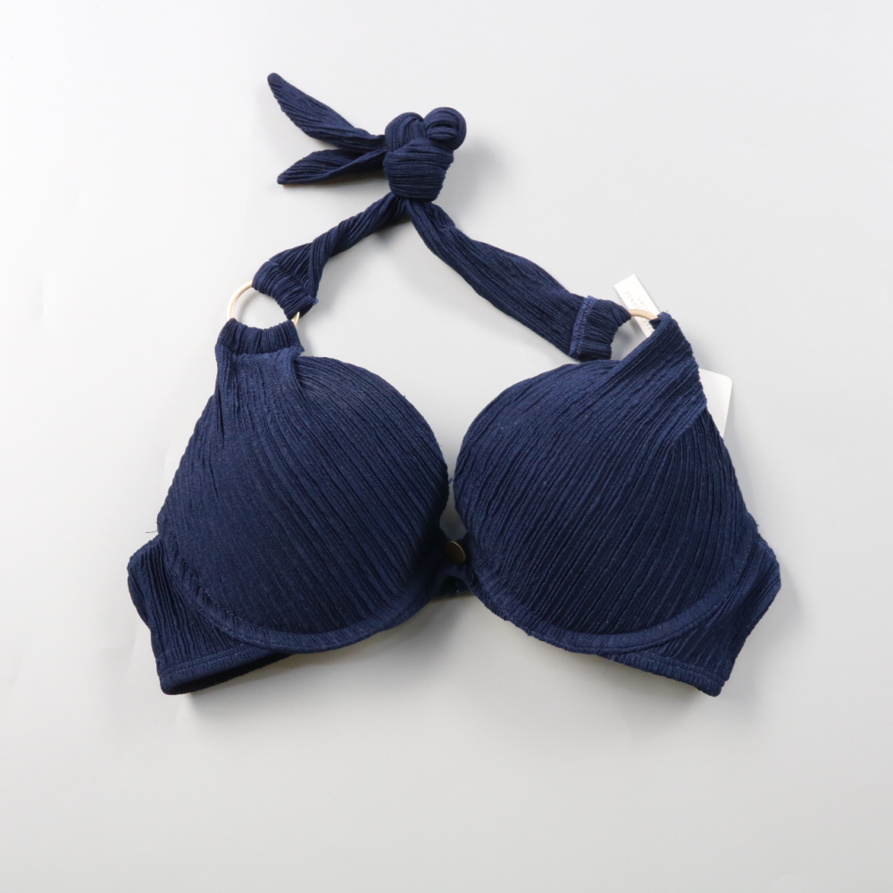 Верх от купальника Hunkemöller тёмно-синего цвета с формованными чашками push-up и завязкой на шее. Подойдёт для пляжа и бассейна, хорошо держит форму и подчёркивает грудь. Рифлёная фактура ткани выглядит аккуратно и быстро сохнет.