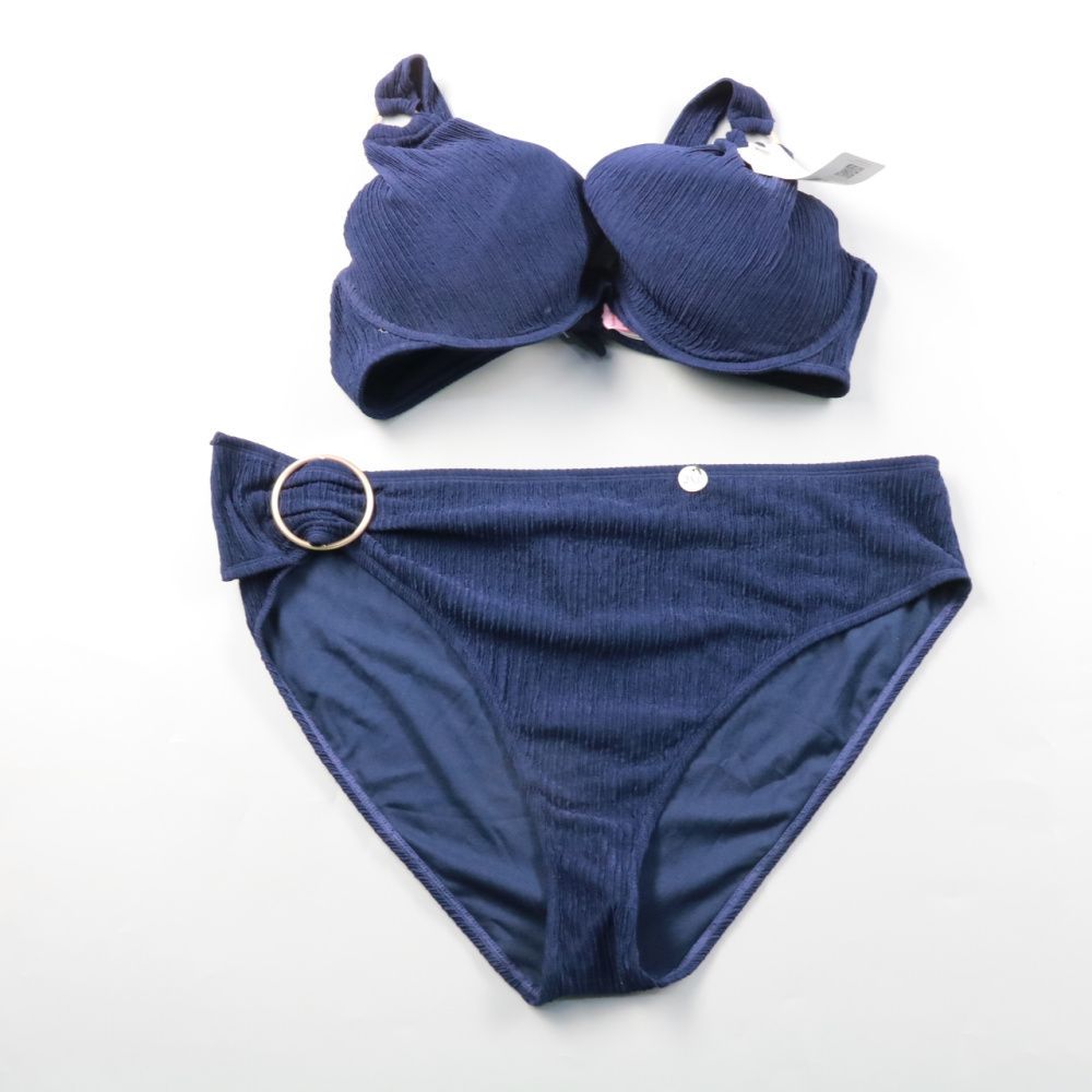Раздельный купальник (бикини) в тёмно-синем цвете с фактурной тканью в рубчик и декоративным кольцом на плавках. Подойдёт для пляжа и бассейна, верх на косточках поддерживает грудь. Быстро сохнет и комфортно сидит за счёт эластана в составе.