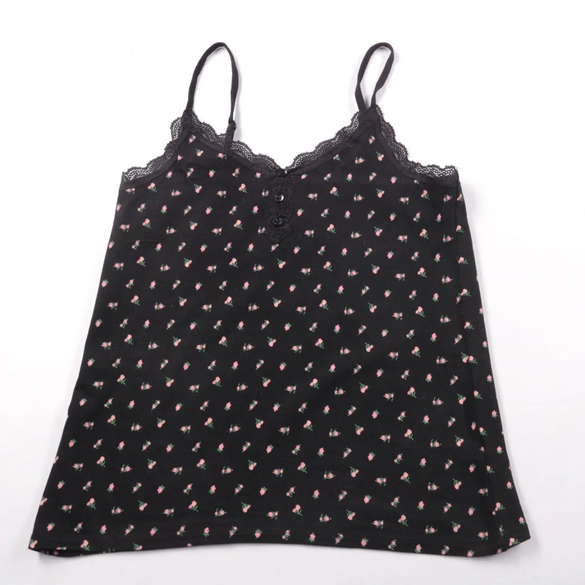 Женская майка Primark на тонких бретелях с кружевной отделкой и мелким цветочным принтом. Подойдёт для дома и сна, а также как базовый слой под кардиган или жакет. Лёгкая и компактная, удобно брать в поездки.