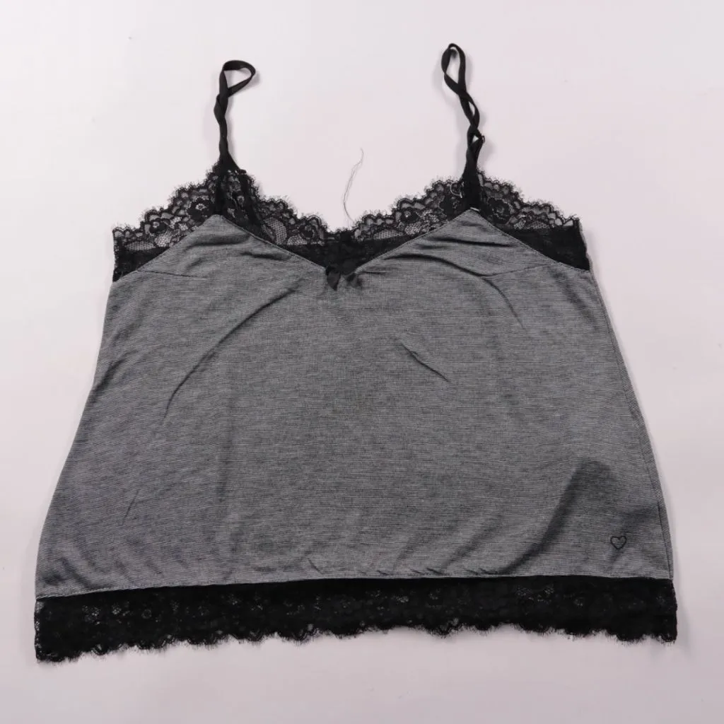 Женский топ Censored серого цвета на тонких бретелях с чёрной кружевной отделкой по линии декольте и по низу. Подойдёт для сна и дома или как нижний слой под рубашку/кардиган. Мягкий трикотаж тянется и комфортно садится по фигуре.