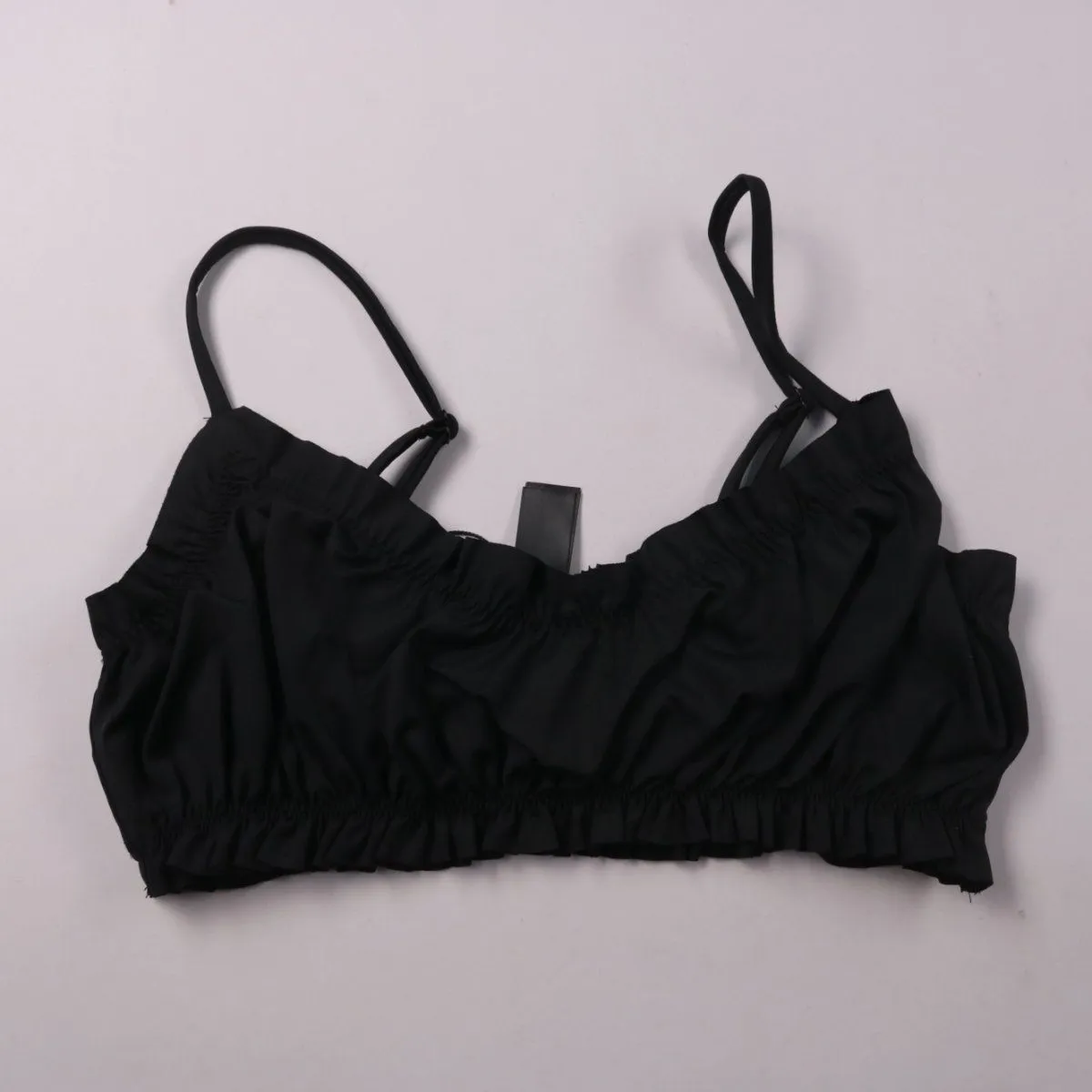 Чёрный бюстгальтер-бралетт без косточек с тонкими бретелями и мягкой посадкой. Подойдёт для повседневной носки и как базовый топ под рубашку или кардиган. Эластичный пояс по низу помогает комфортно держаться и не давит.
