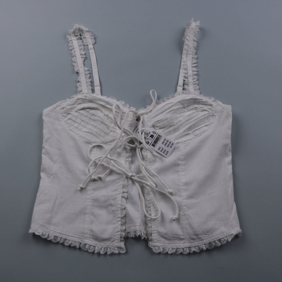 Бюстье Ginatricot белого цвета с декоративной шнуровкой спереди и кружевной отделкой на бретелях и по низу. Подойдёт как нижний слой под рубашку или как топ для летних образов. Утяжка шнуровкой помогает подогнать посадку по фигуре.