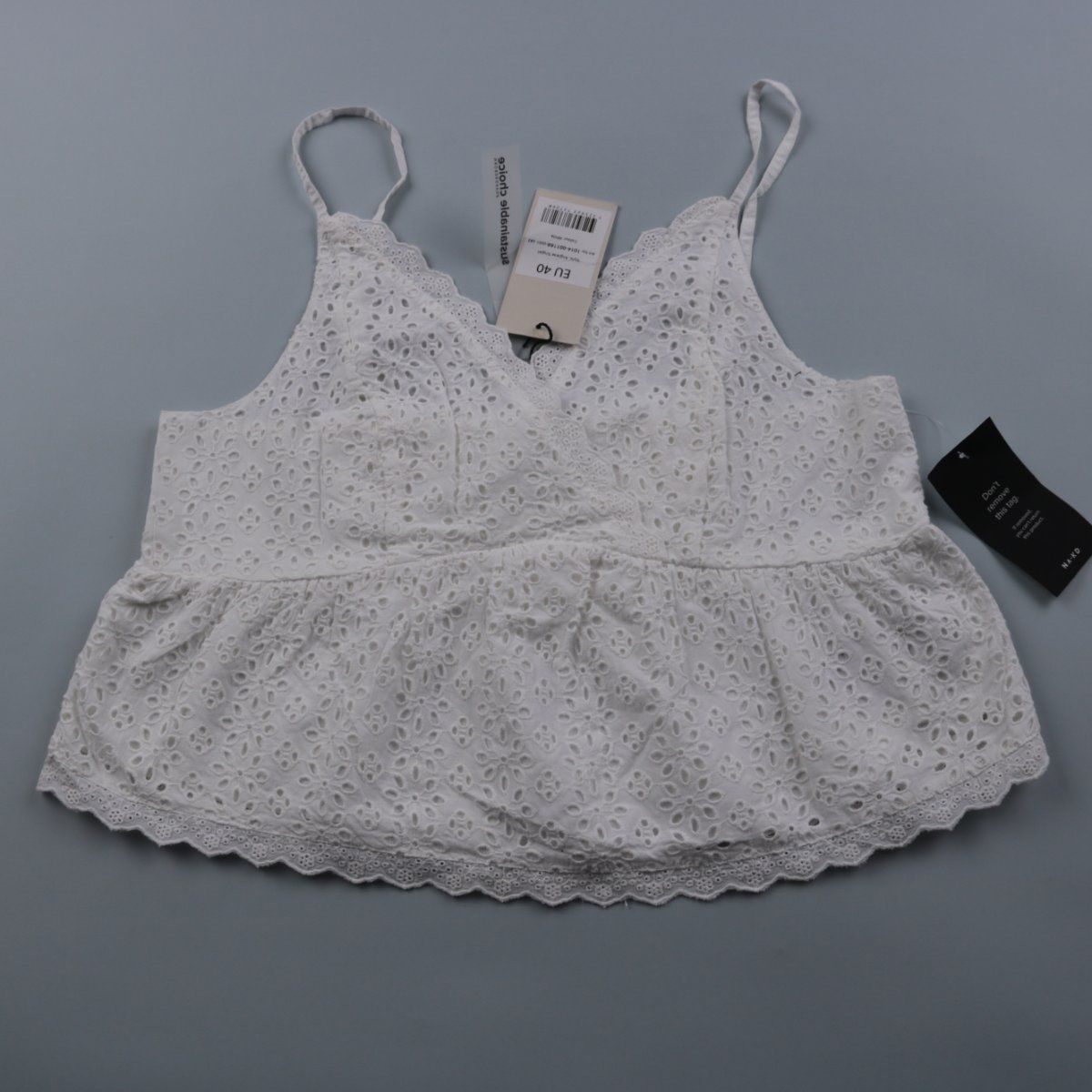 Женский бельевой топ NA-KD белого цвета с тонкими бретелями и ажурной вышивкой. Подойдёт для дома и сна, а также как лёгкий верх под рубашку или кардиган. Натуральный хлопок хорошо дышит и комфортен к телу.