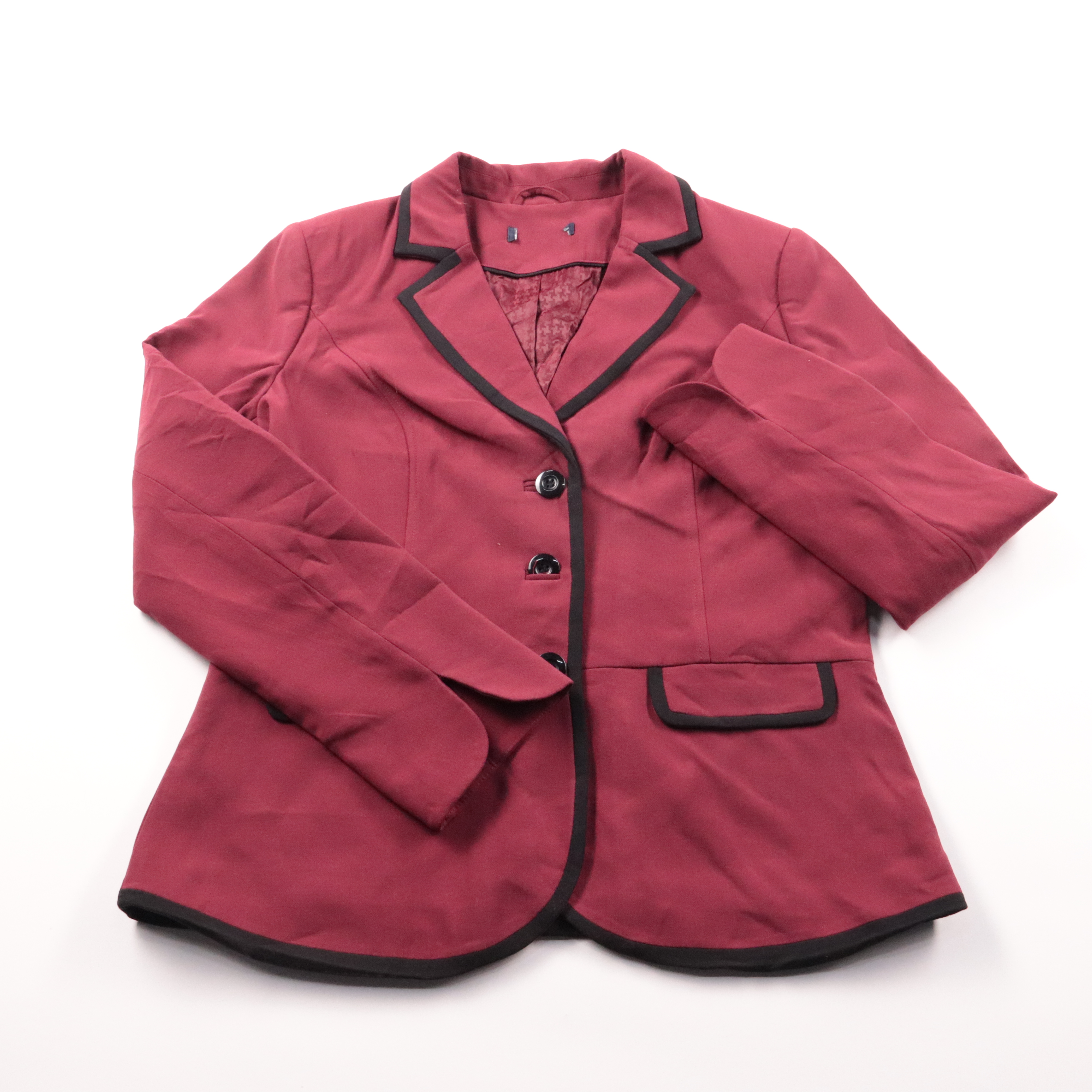 Женский пиджак бордового цвета с контрастной чёрной окантовкой и тремя пуговицами, без указания бренда на бирке. Подойдёт для офиса и повседневных образов, хорошо сочетается с базовыми брюками и юбками. Плотная ткань держит форму и аккуратно выглядит в...
