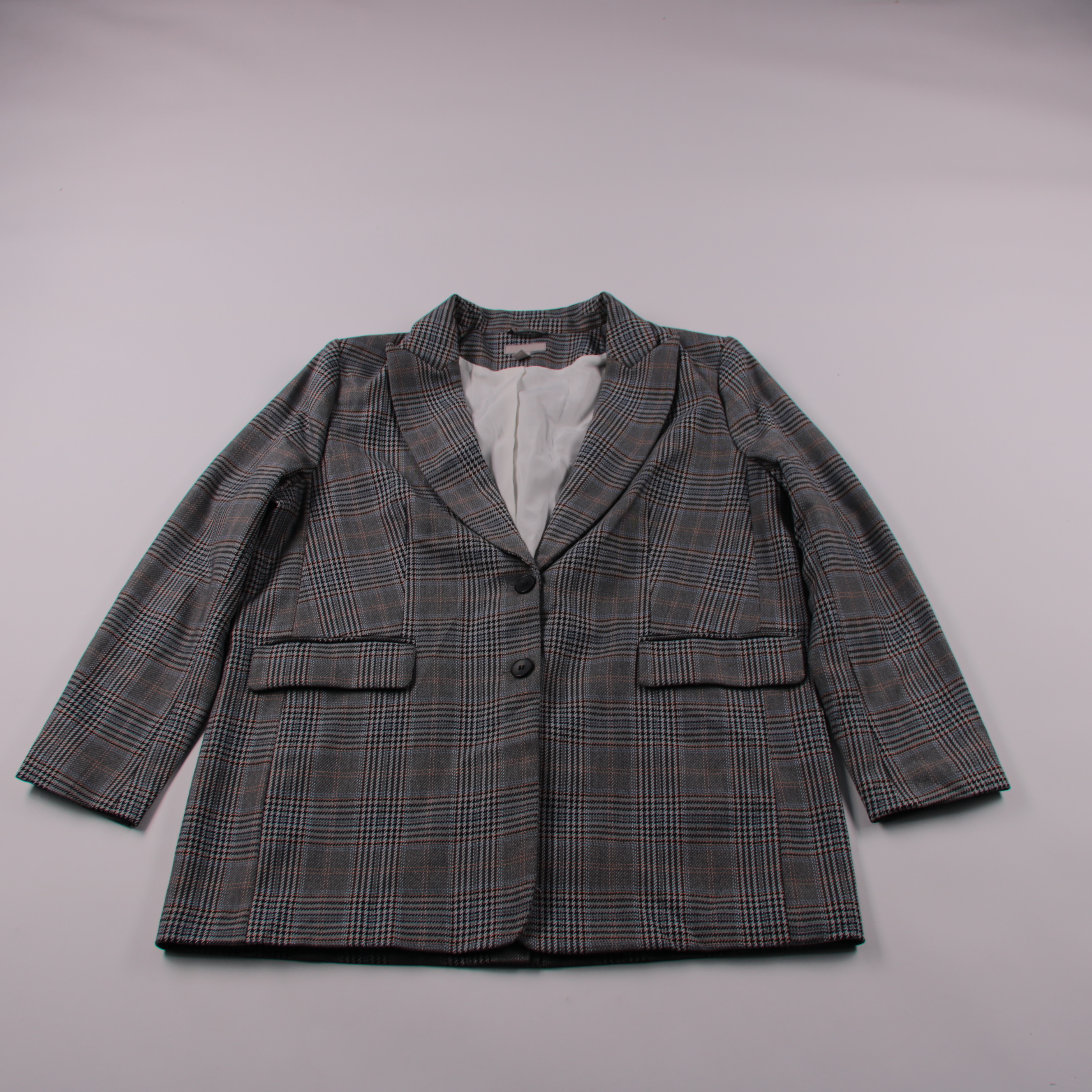 Женский пиджак H&M в серую клетку, с отложным воротником и застёжкой на пуговицы. Подойдёт для офиса и повседневных образов в прохладную погоду. Практичный плюс — есть подкладка, поэтому пиджак хорошо держит форму и удобно сидит.