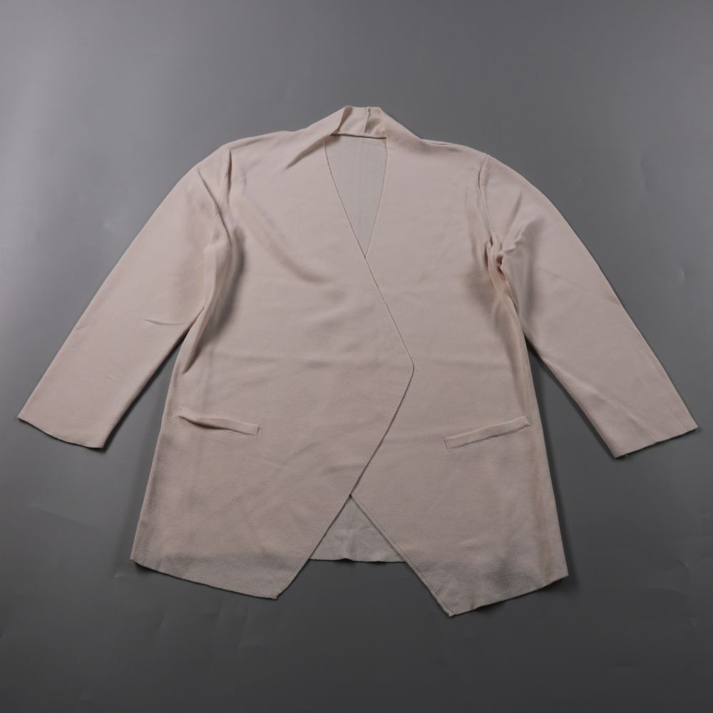 Женский пиджак без бренда в светло-бежевом цвете, мягкий трикотажный материал и запах без застёжки. Подойдёт для офиса и на каждый день, хорошо смотрится с брюками, юбкой или джинсами. Лёгкий и удобный, не стесняет движений.