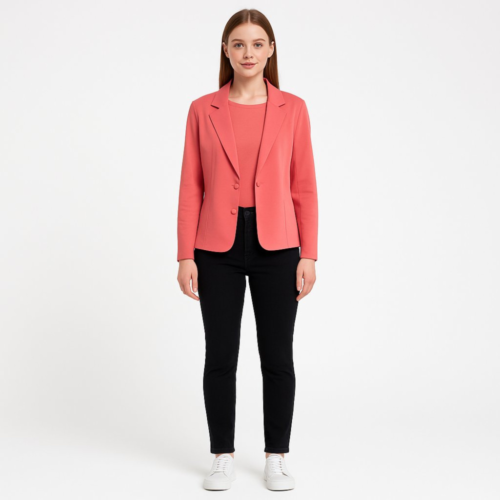 Женский пиджак Gina Benotti кораллового цвета, приталенного кроя с лацканами и застёжкой на пуговицы. Подойдёт для офиса и повседневных образов, хорошо сочетается с брюками и джинсами. Эластичная ткань комфортно садится по фигуре и почти не мнётся.