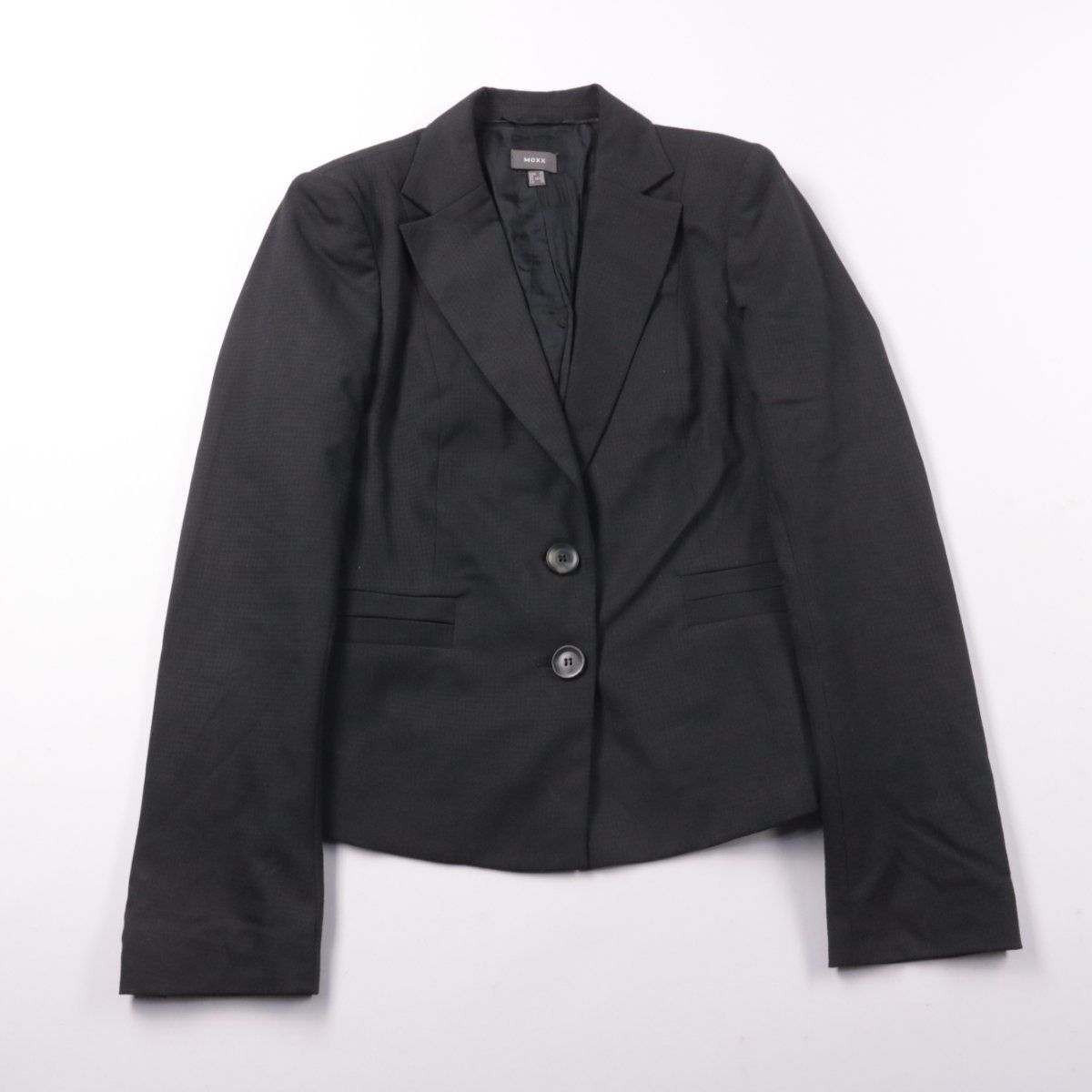 Женский пиджак Mexx чёрного цвета с классическими лацканами и застёжкой на две пуговицы. Подойдёт для офиса, учёбы и деловых встреч, легко сочетается с брюками, юбкой или платьем. Ткань немного тянется за счёт эластана, а подкладка из ацетата комфортно скользит по одежде.