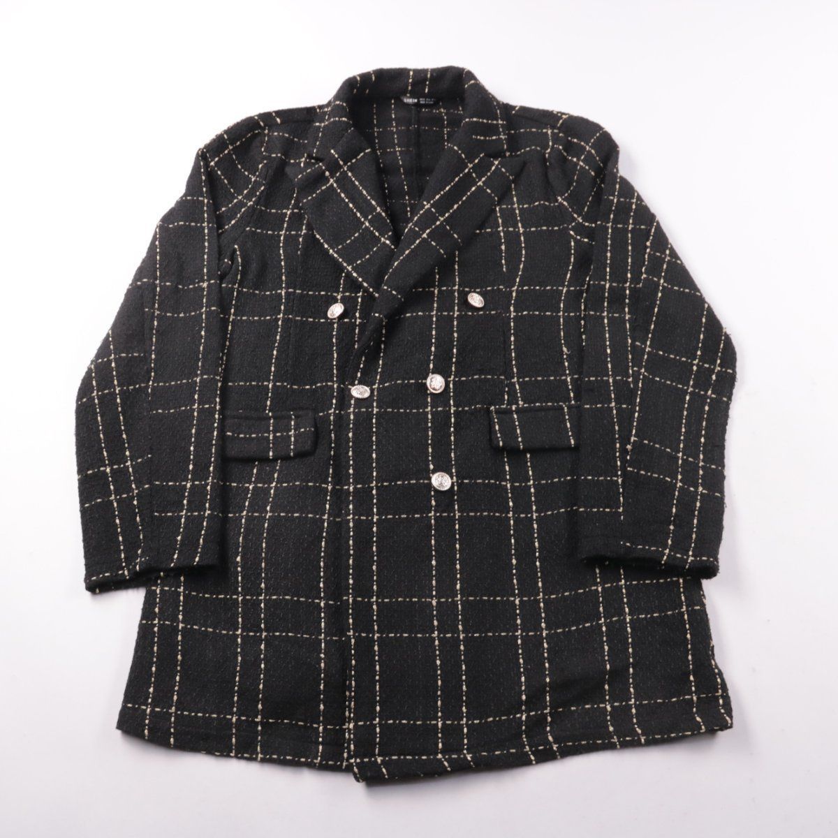 Женский двубортный пиджак SHEIN чёрного цвета в клетку с контрастной строчкой и декоративными пуговицами. Подойдёт для офиса и повседневных образов в прохладную погоду. Плотная ткань хорошо держит форму и выглядит аккуратно.