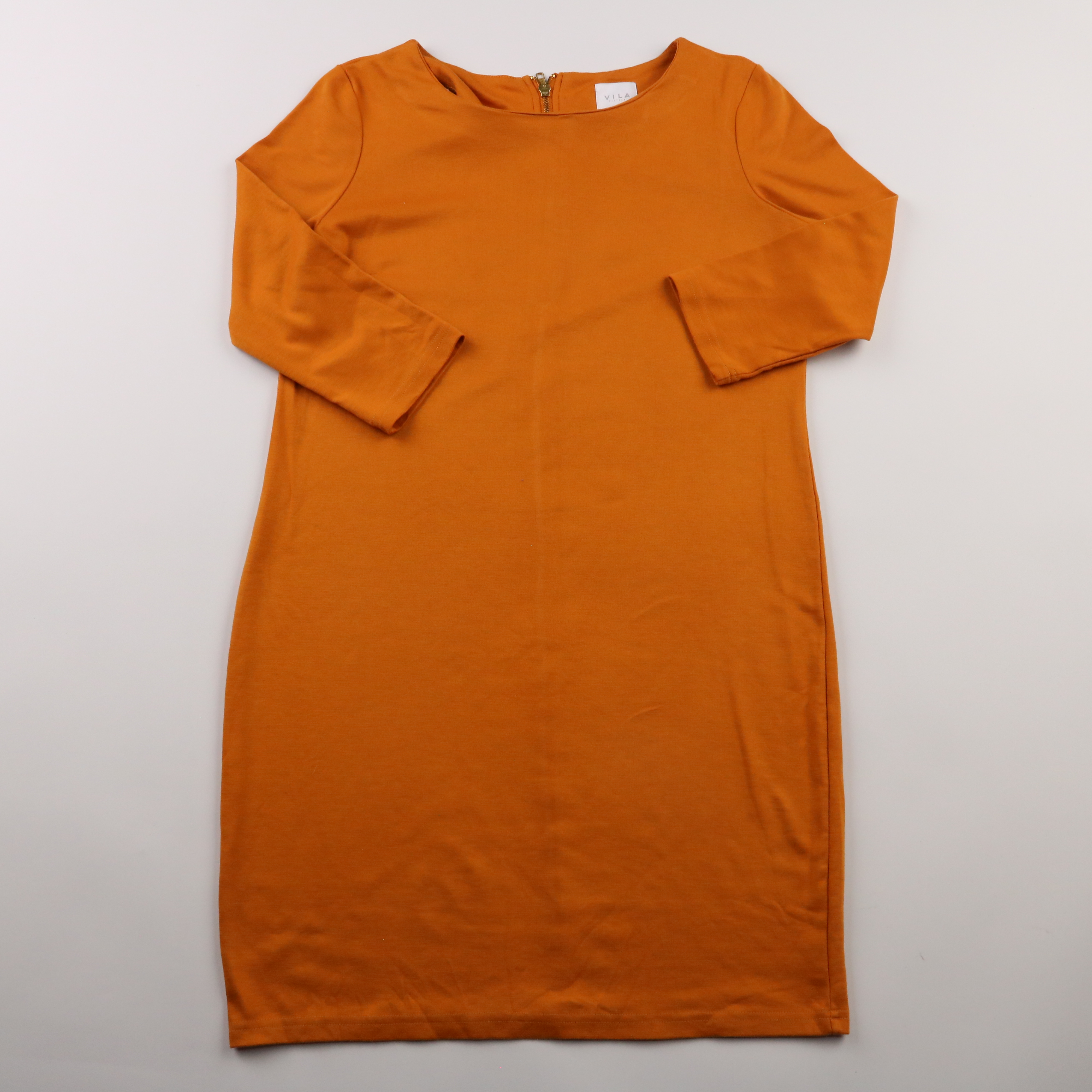 Платье Vila прямого кроя в тёплом оранжевом цвете, с рукавом 3/4 и молнией сзади. Подойдёт для офиса и на каждый день, легко сочетается с жакетом или кардиганом. Практичный трикотаж почти не мнётся и комфортен в носке.