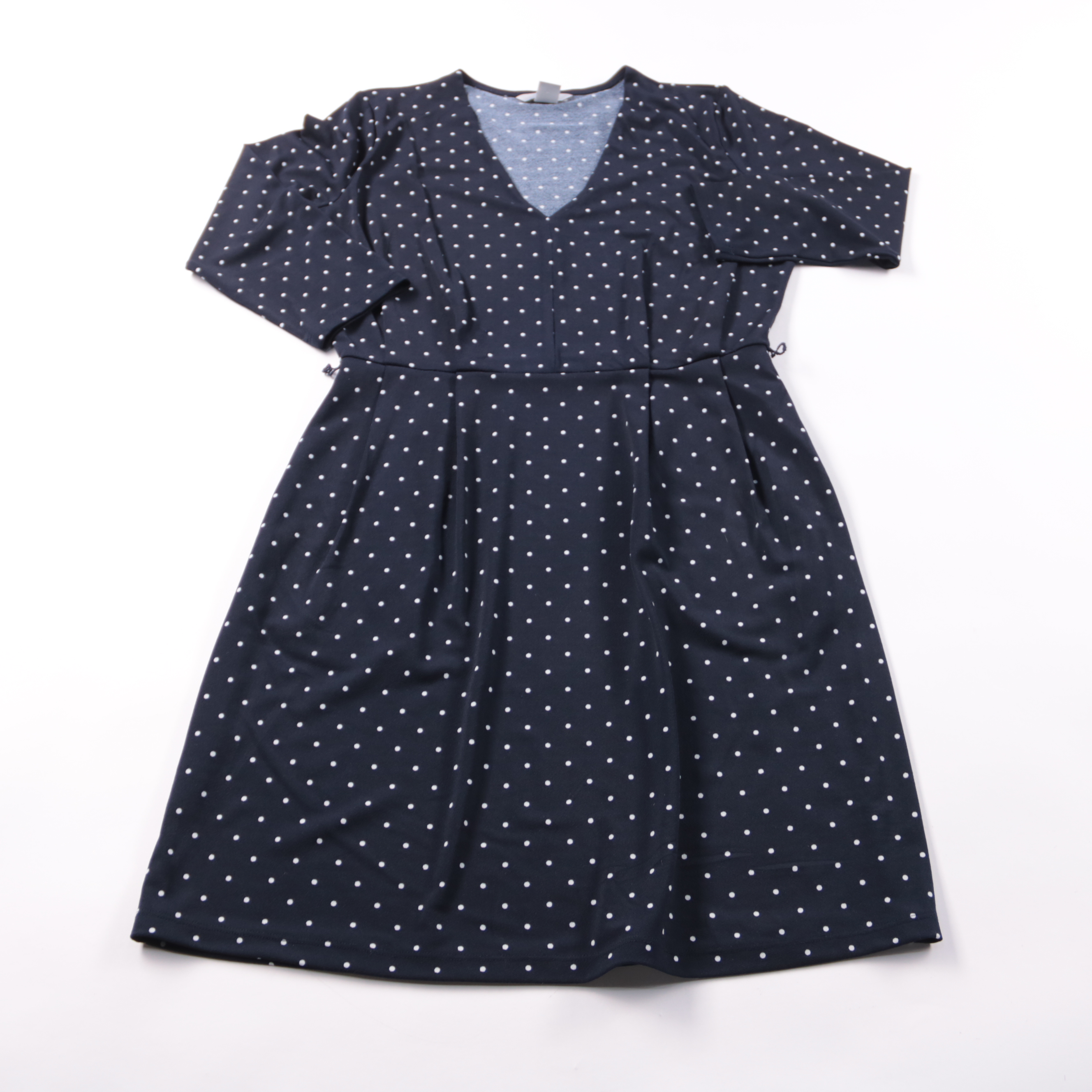Повседневное платье H&M тёмно-синего цвета в белый горошек, с V‑вырезом и рукавом 3/4. Подойдёт для офиса и на каждый день, хорошо сочетается с балетками или ботильонами. Материал мягко драпируется и не требует сложного ухода.