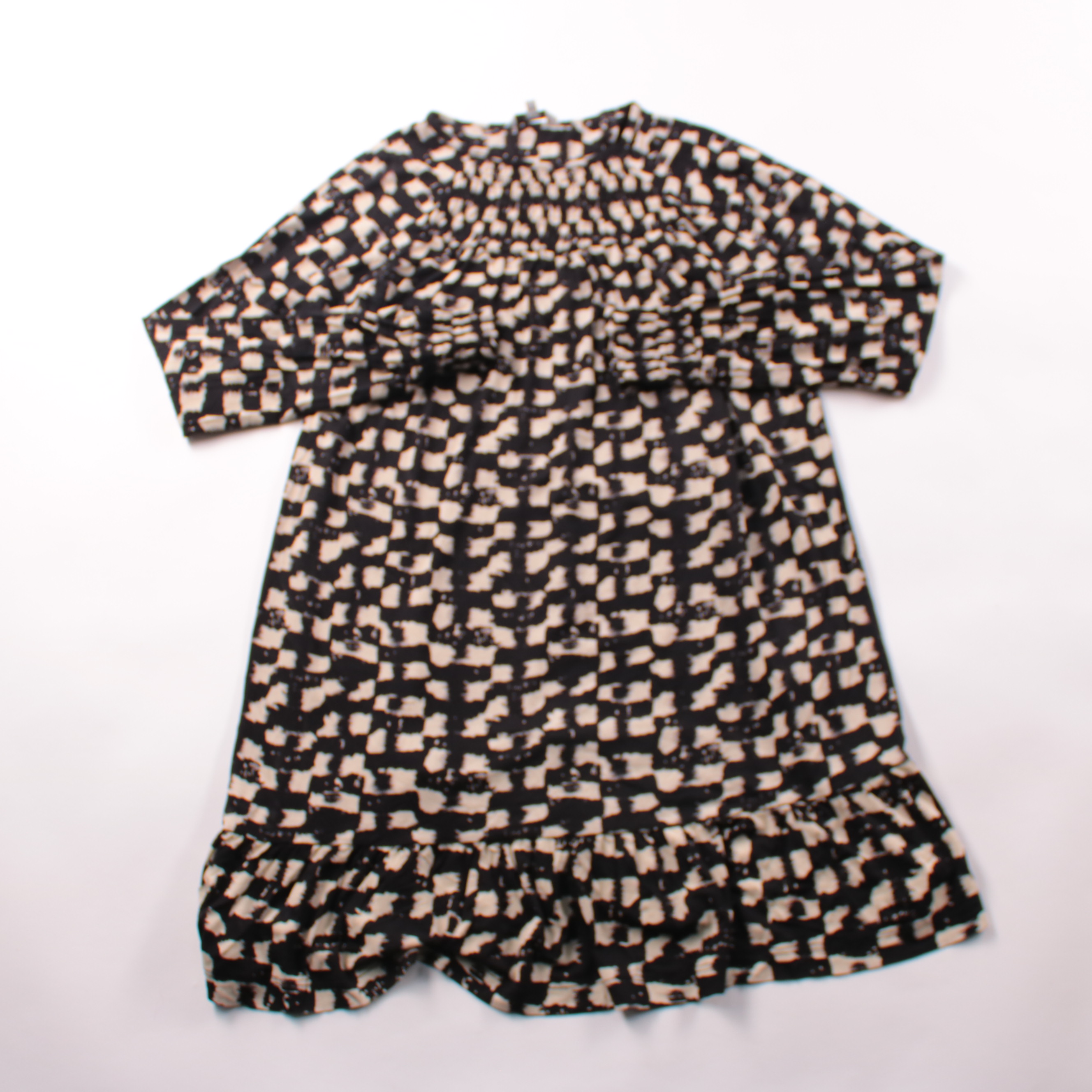 Повседневное платье Next с абстрактным черно-бежевым принтом и свободным силуэтом с воланом по низу. Подойдёт для офиса и на каждый день, легко сочетается с ботильонами или кедами. Вискоза в составе приятна к телу и хорошо драпируется.